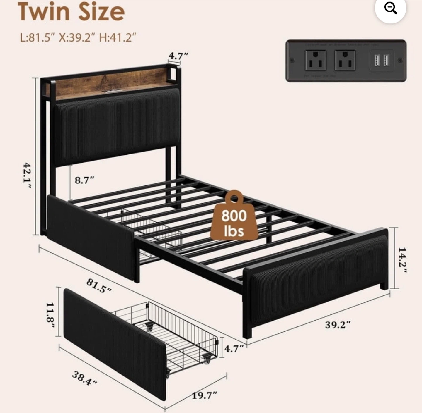 This twin size bed frame and Mattress features a storage headboard with built-in USB ports and power outlets for convenient charging. It's constructed with a sturdy metal frame and includes two drawers for extra storage. The upholstered headboard adds a touch of comfort.pick up Only