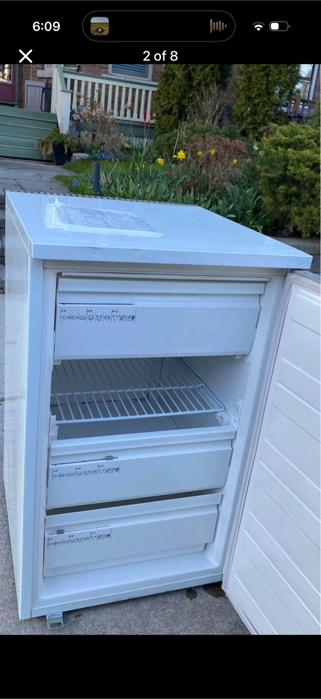 This is a white Celebrity upright freezer. It features three clear freezer drawers. A compact freezer for your extra food storage needs!