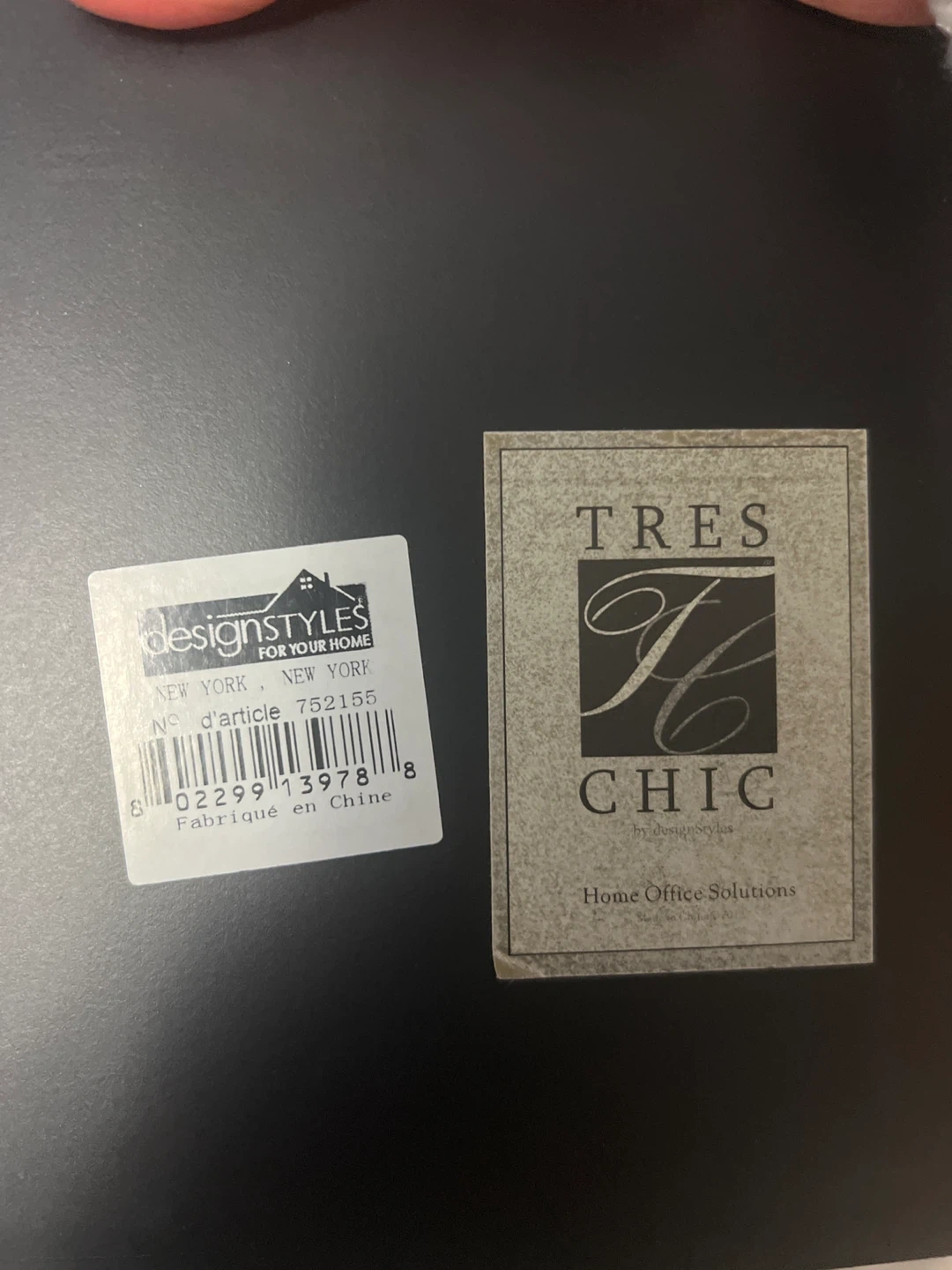Black desk organizer from DesignStyles Tres Chic. It's made of wood and has three compartments for mail or papers. Dimensions are approximately 12 inches wide and 7 inches tall. This organizer helps keep your desk tidy!