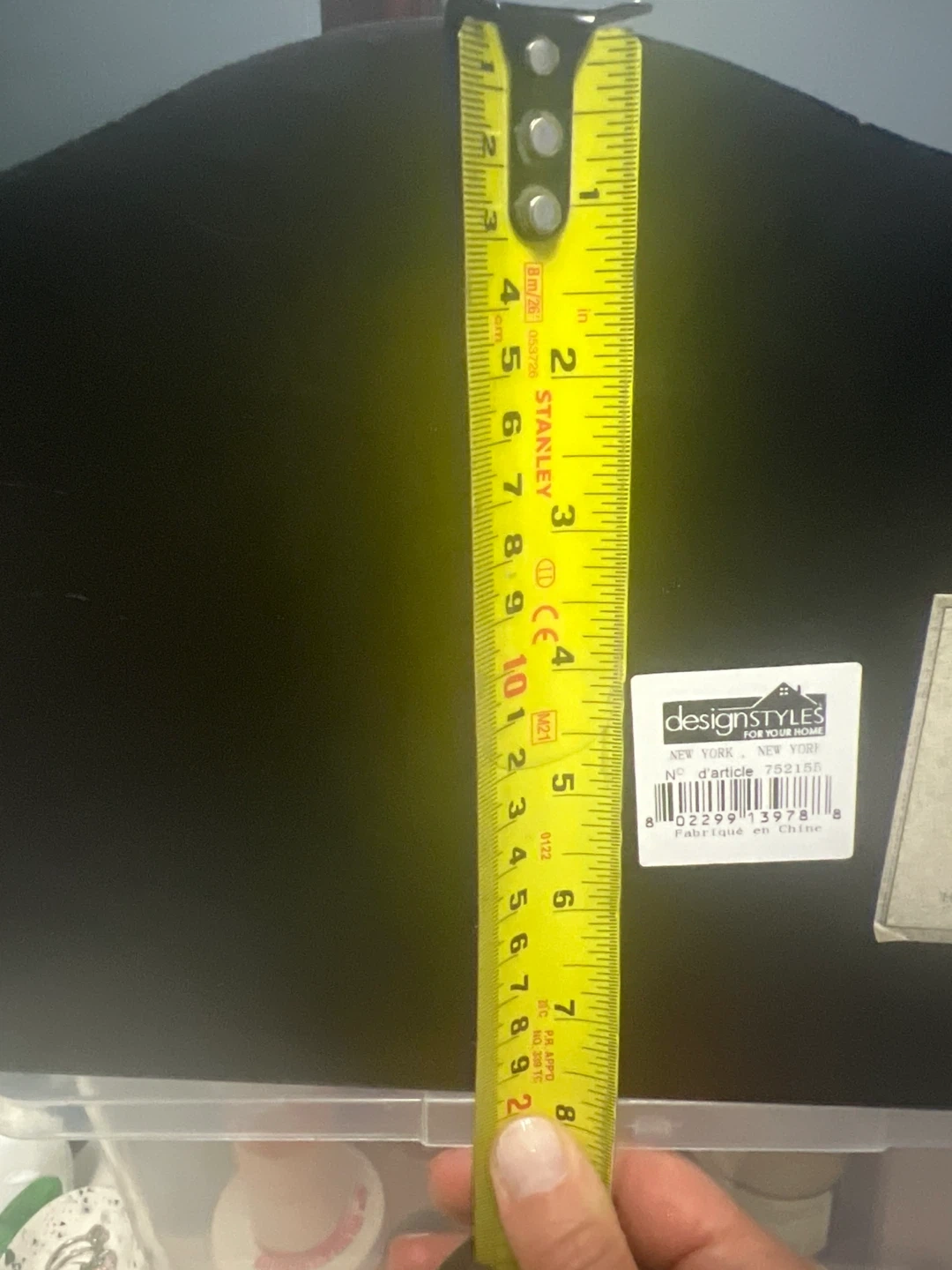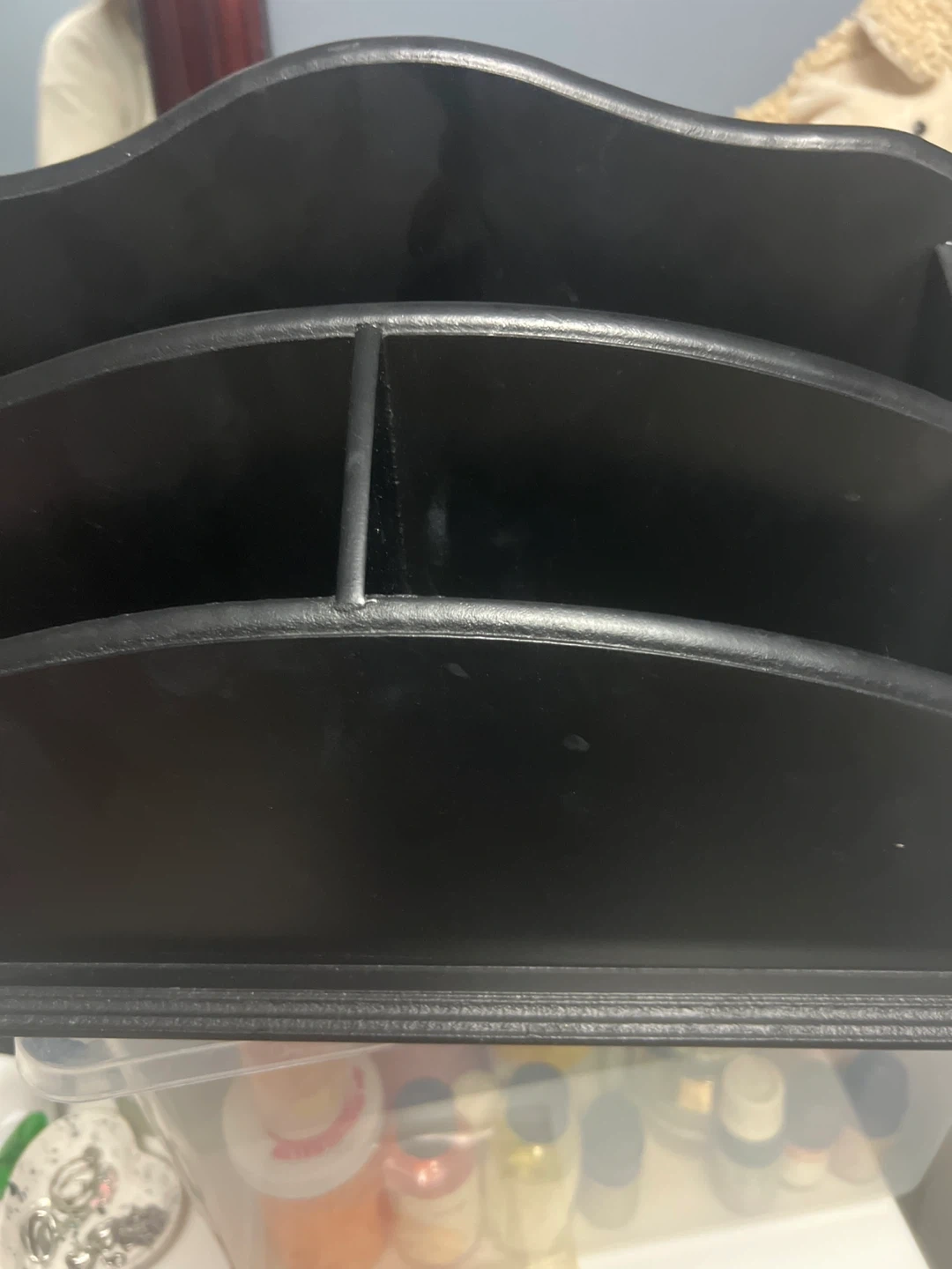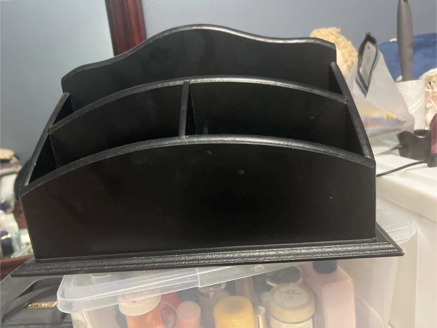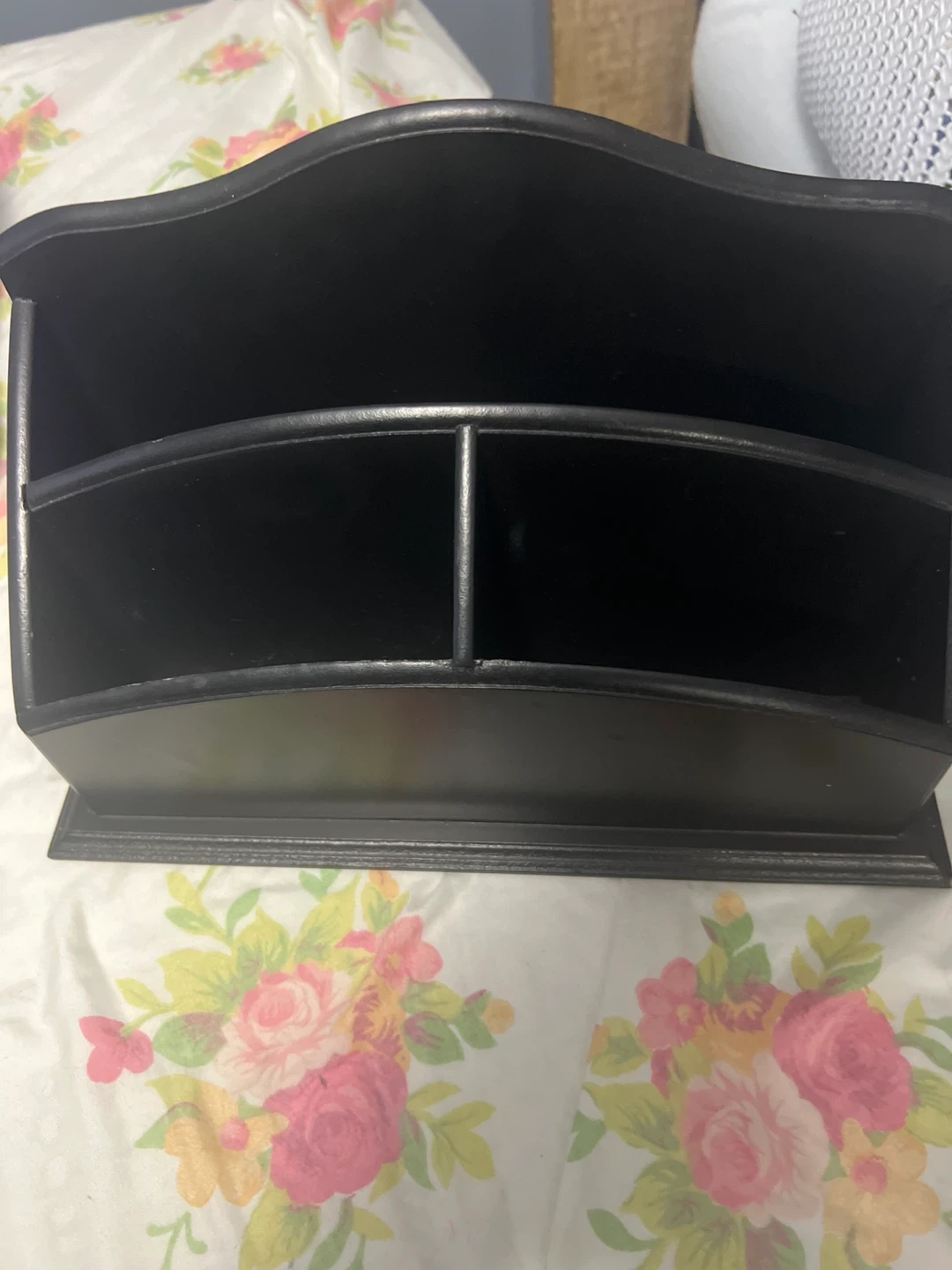 Black desk organizer from DesignStyles Tres Chic. It's made of wood and has three compartments for mail or papers. Dimensions are approximately 12 inches wide and 7 inches tall. This organizer helps keep your desk tidy!