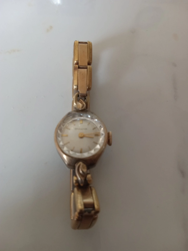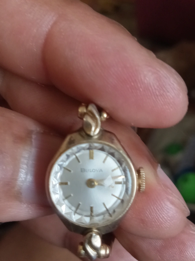 Selling a vintage Bulova ladies watch. It has a gold-tone finish and a unique crystal face. There are some signs of wear on the band, but it's still a beautiful piece!, automatic