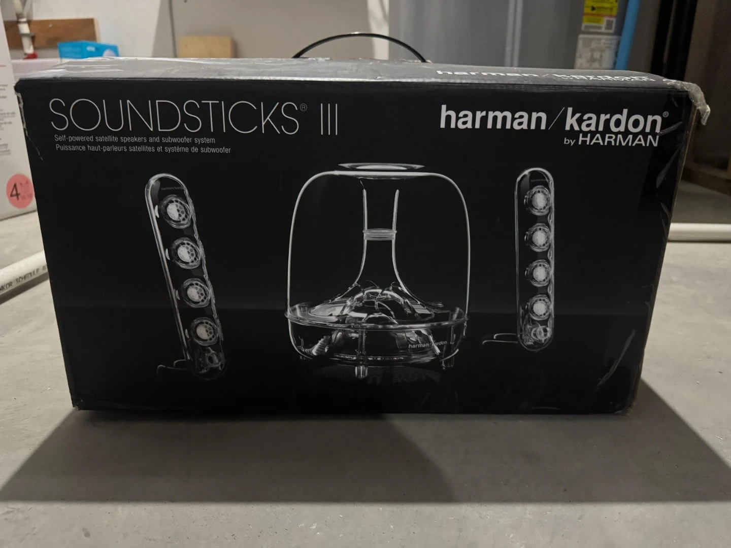 This is a Harman Kardon SoundSticks II self-powered satellite speaker and subwoofer system. It provides a unique audio experience with its iconic design. Includes original packaging.