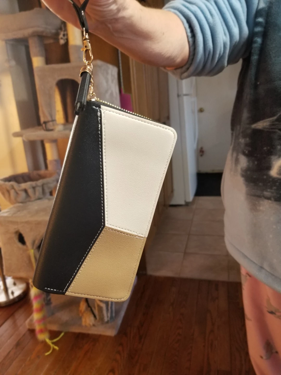 This colourblock wristlet clutch wallet has a zip closure. It's made of faux leather and features black, white, and tan panels. Includes a detachable wrist strap.