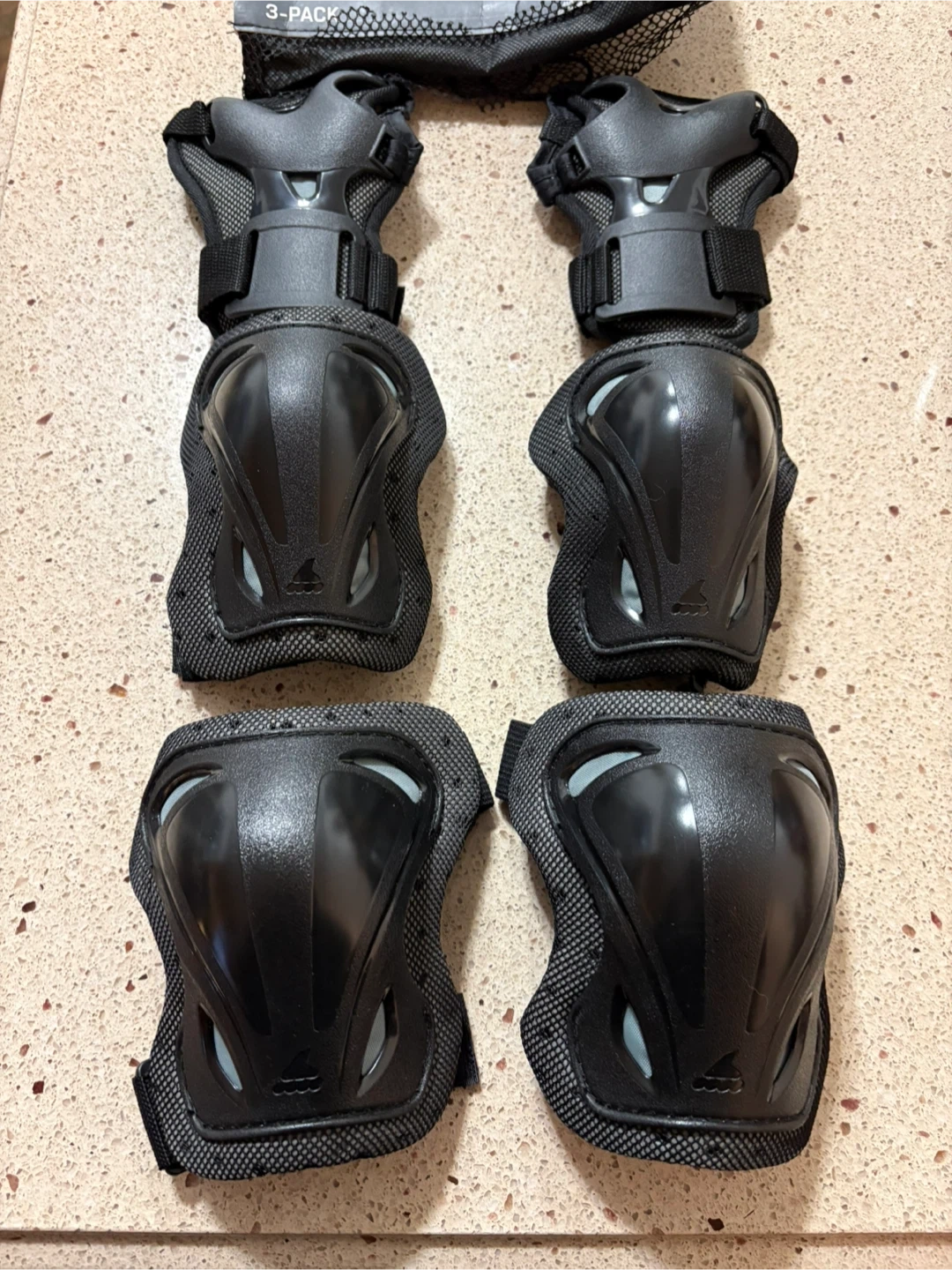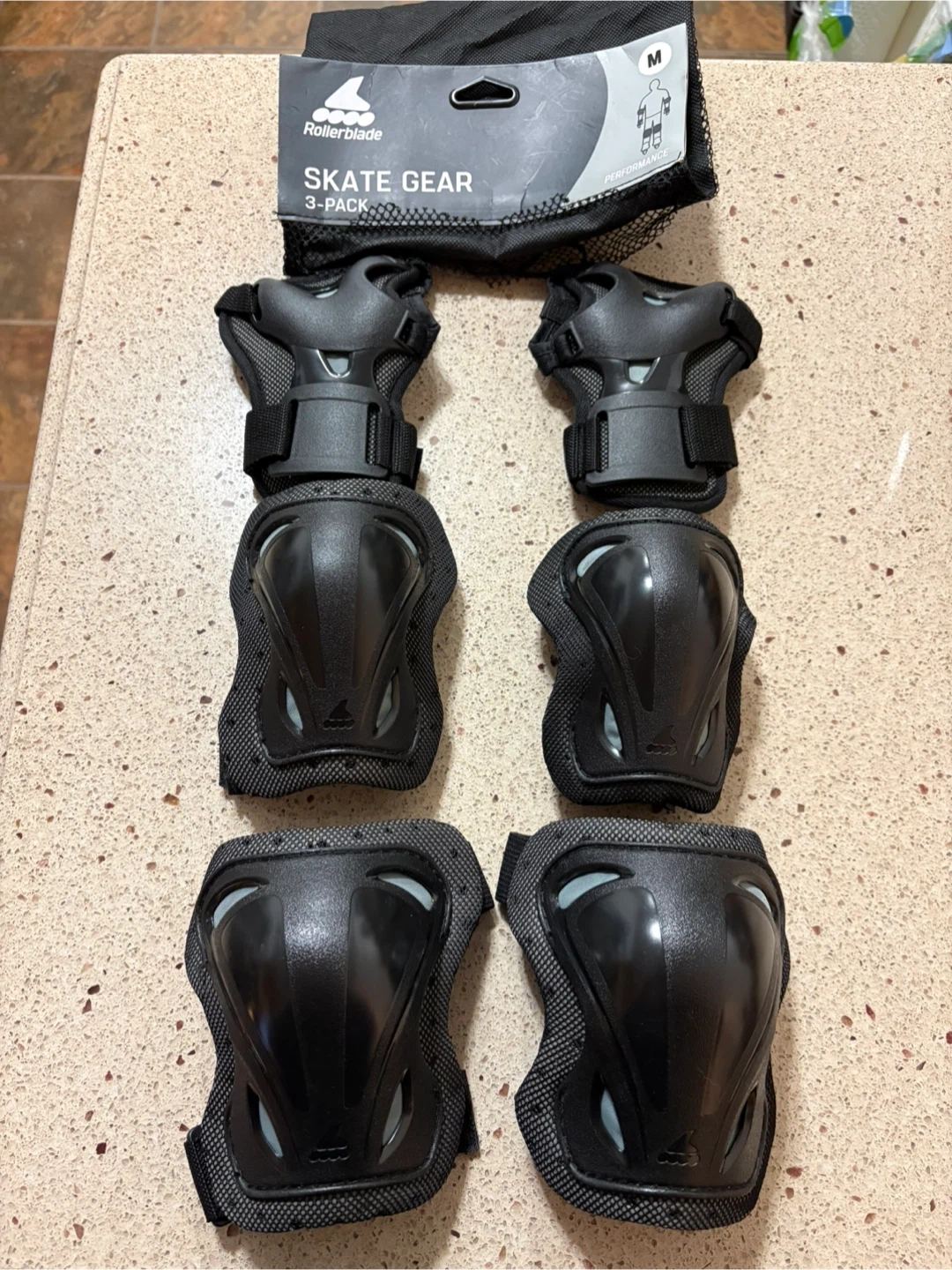This is a 3-pack of Rollerblade skate gear. It includes elbow pads, knee pads, and wrist guards. All pieces are size medium and come in a handy mesh bag.