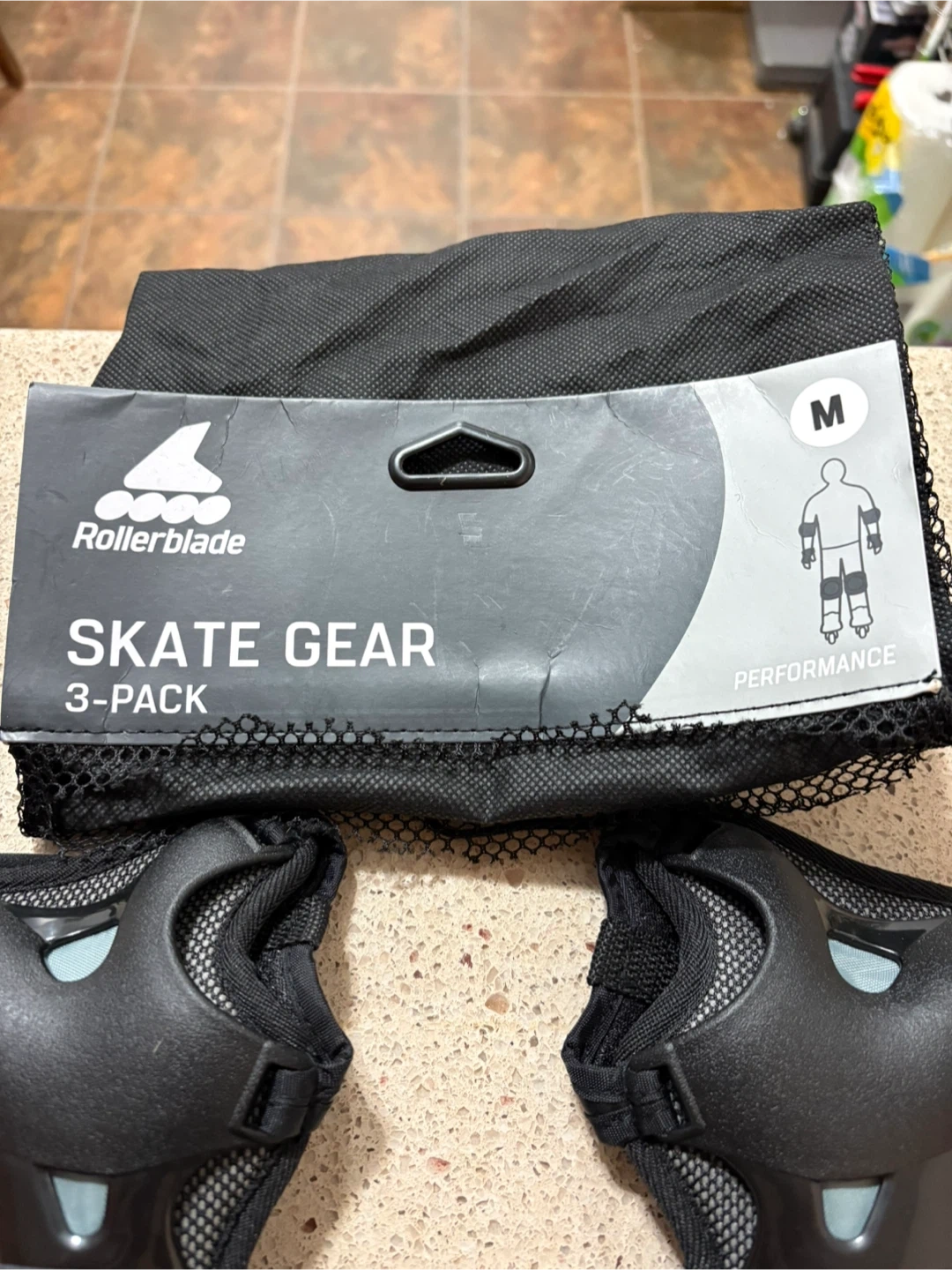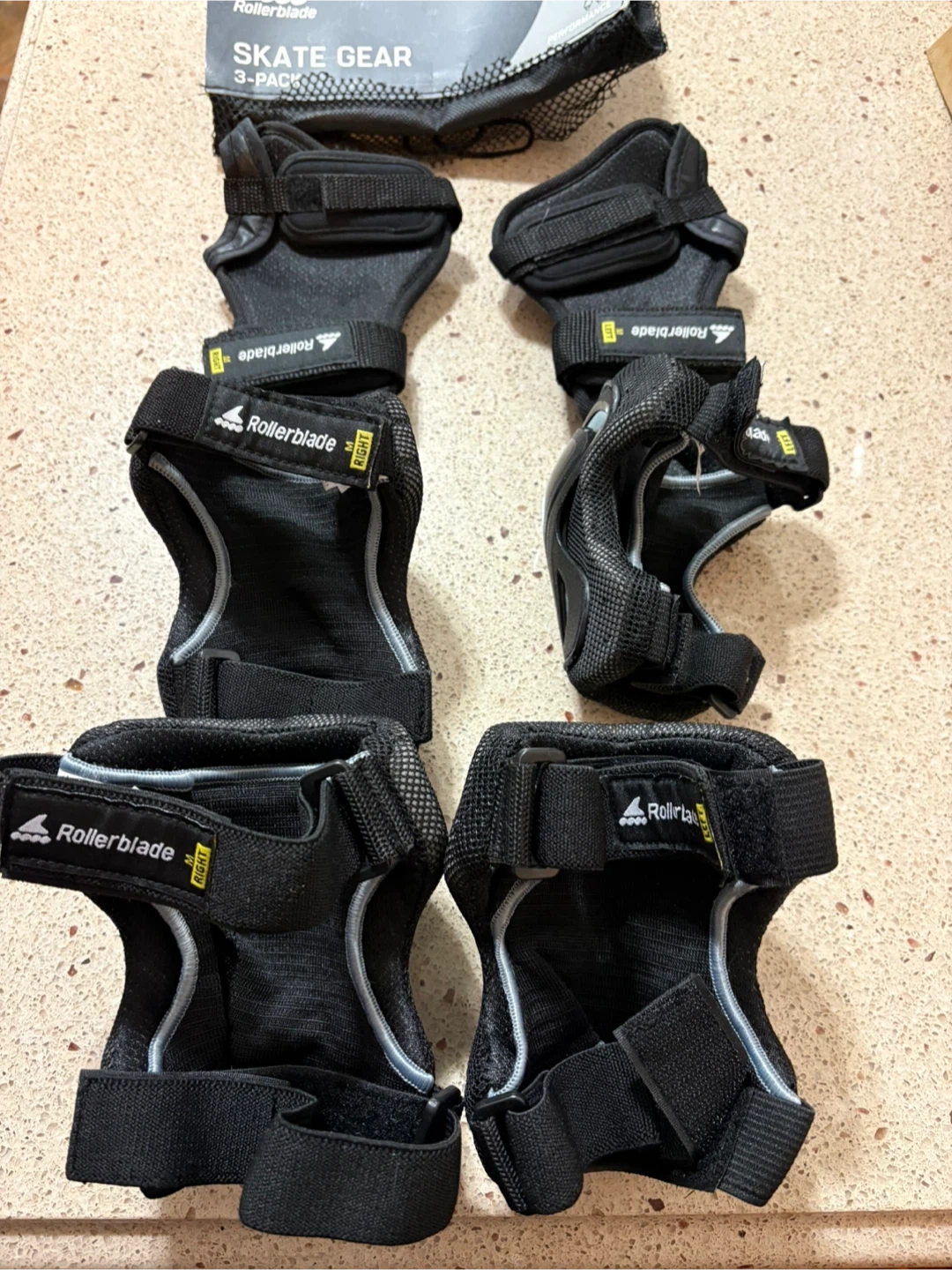This is a 3-pack of Rollerblade skate gear. It includes elbow pads, knee pads, and wrist guards. All pieces are size medium and come in a handy mesh bag.
