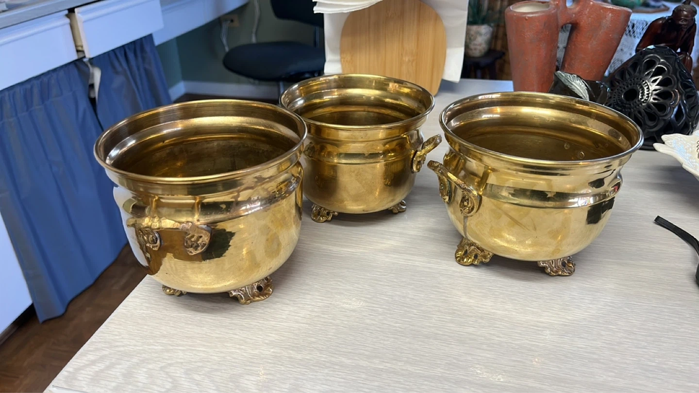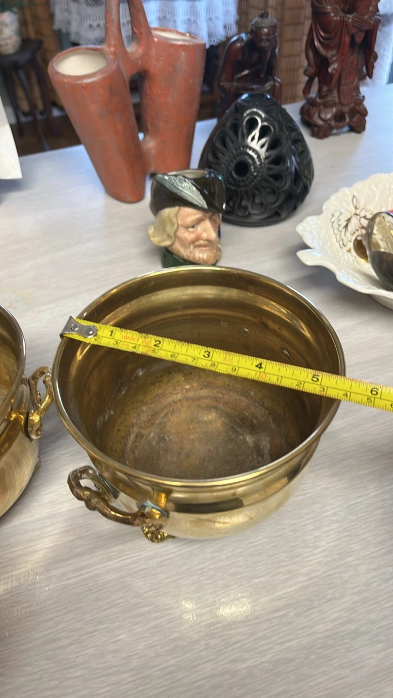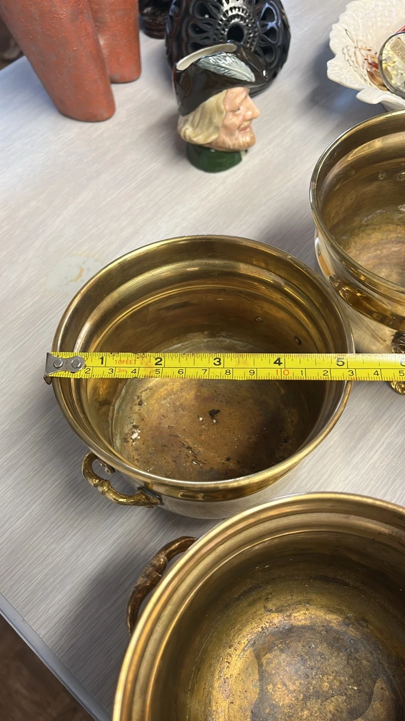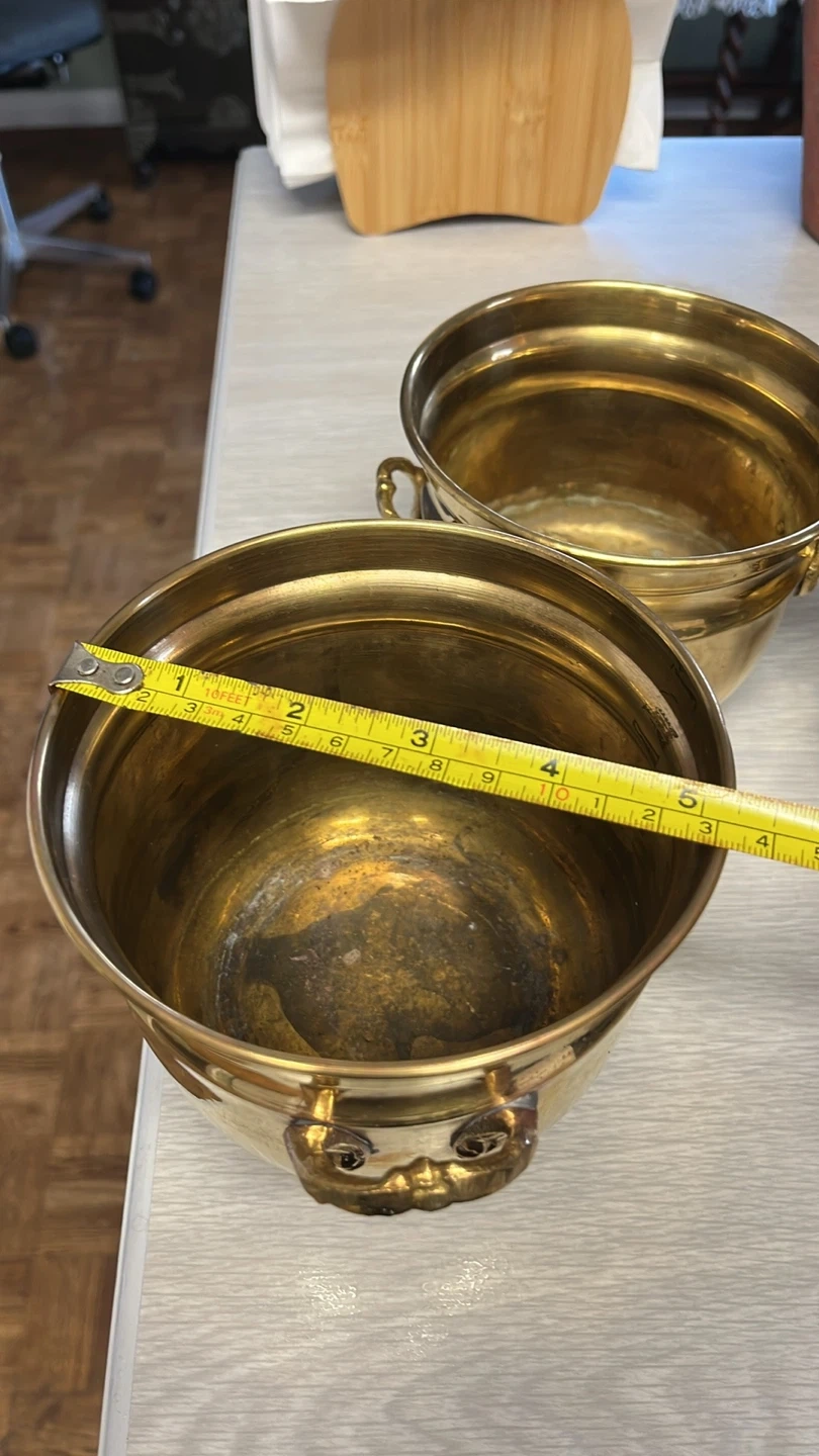 These are vintage brass planter pots. They have a lovely ornate design with handles and feet. They're perfect for small plants or as decorative accents.