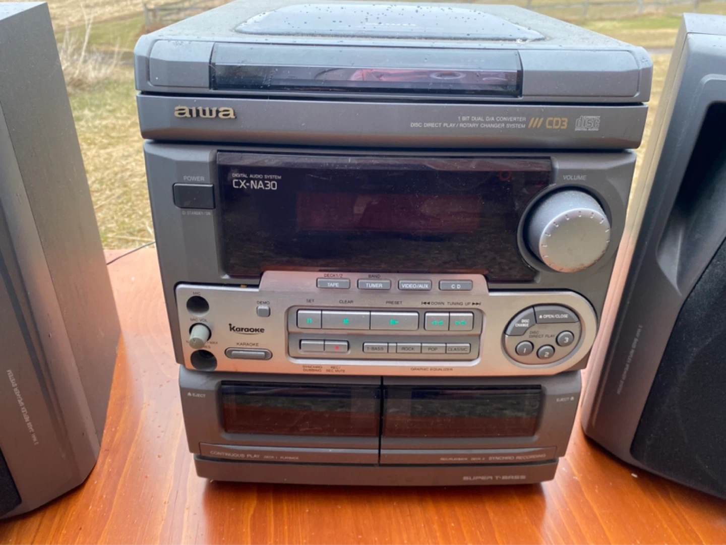 Aiwa CX-NA30 CD Stereo System featuring a tuner, cassette deck, and CD player. Comes with two Aiwa speakers. Manufactured in July 1997. This audio system offers multiple playback options.