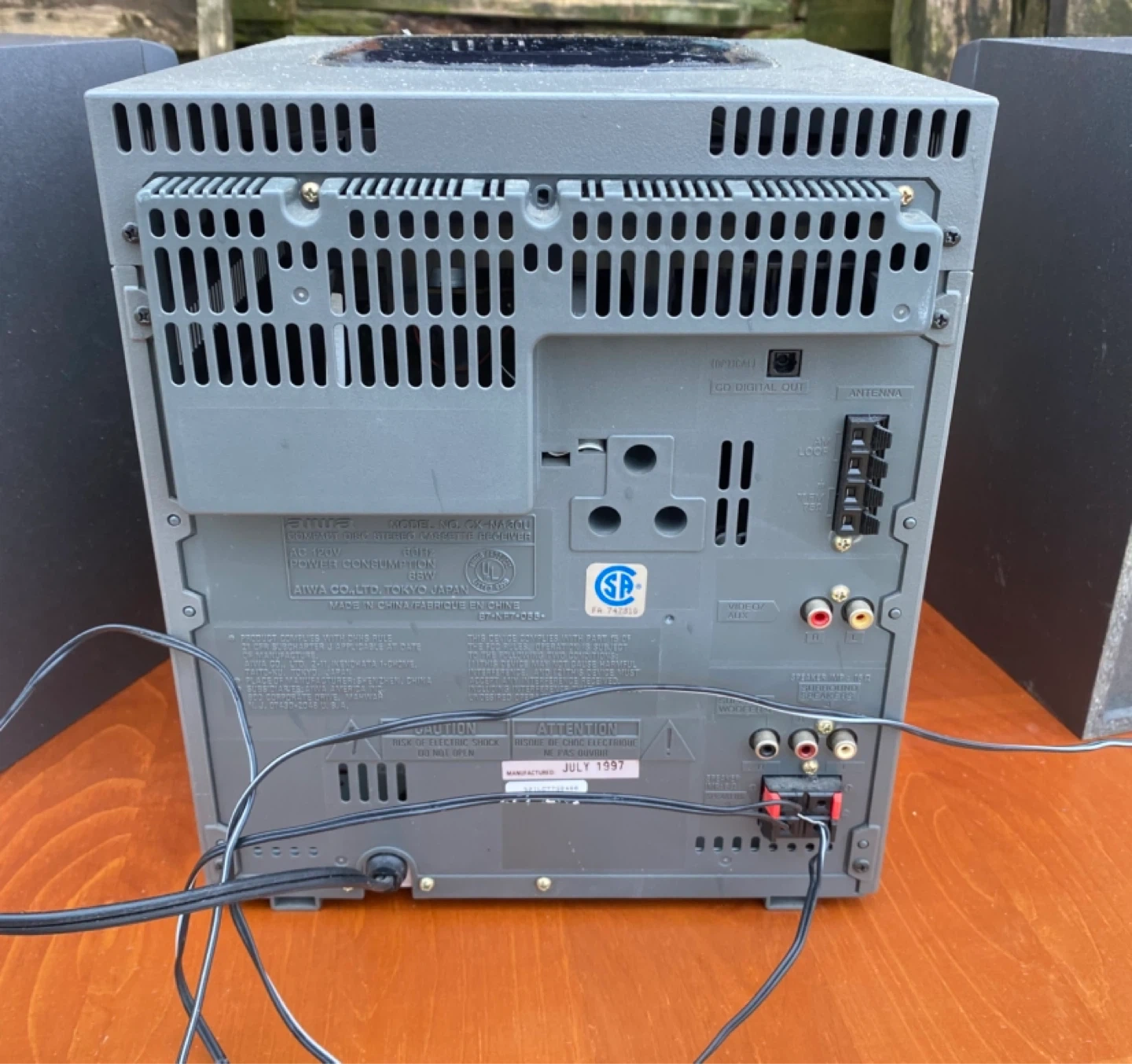 Aiwa CX-NA30 CD Stereo System featuring a tuner, cassette deck, and CD player. Comes with two Aiwa speakers. Manufactured in July 1997. This audio system offers multiple playback options.