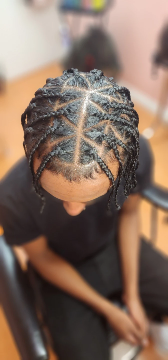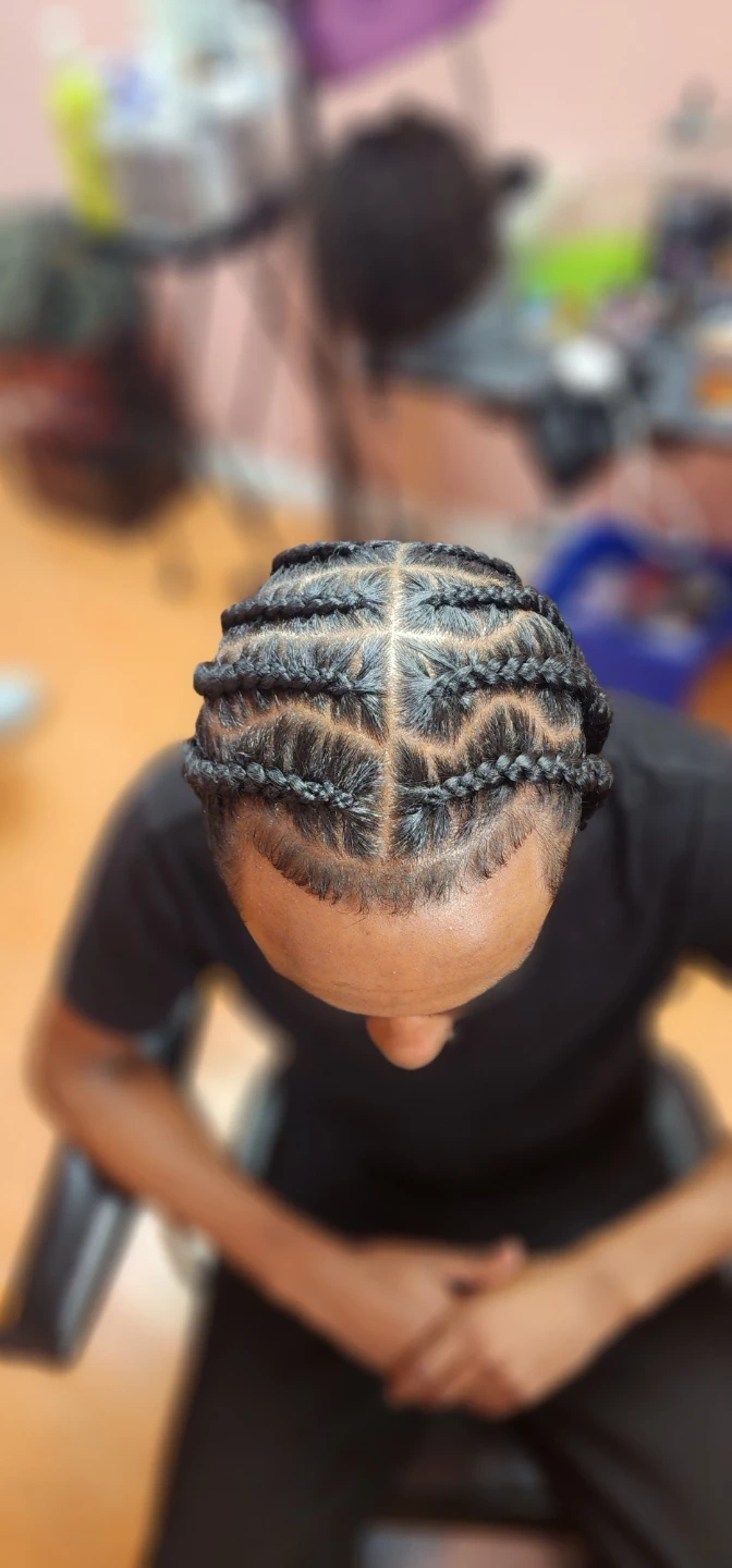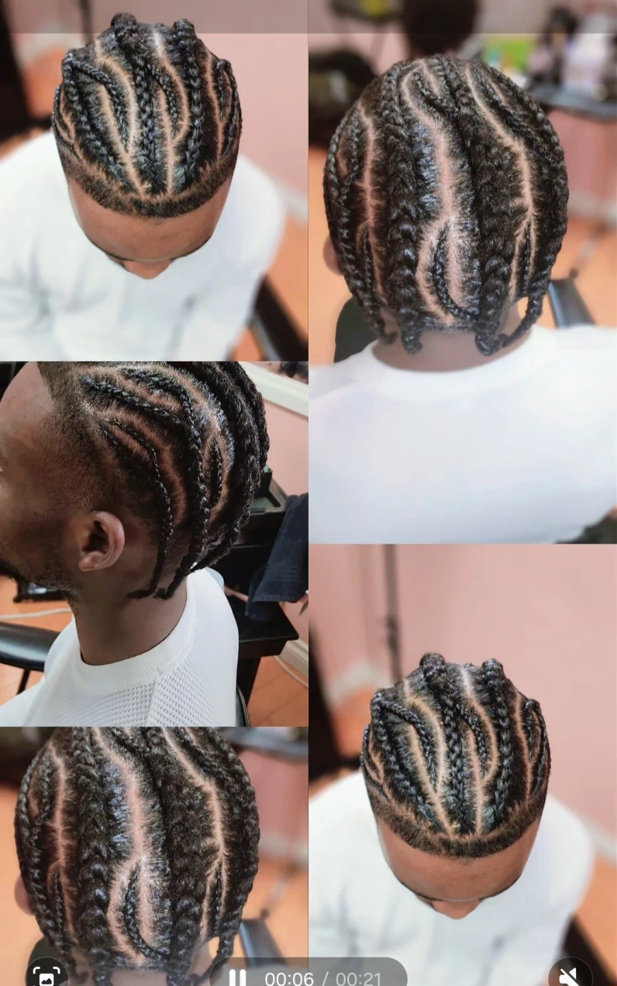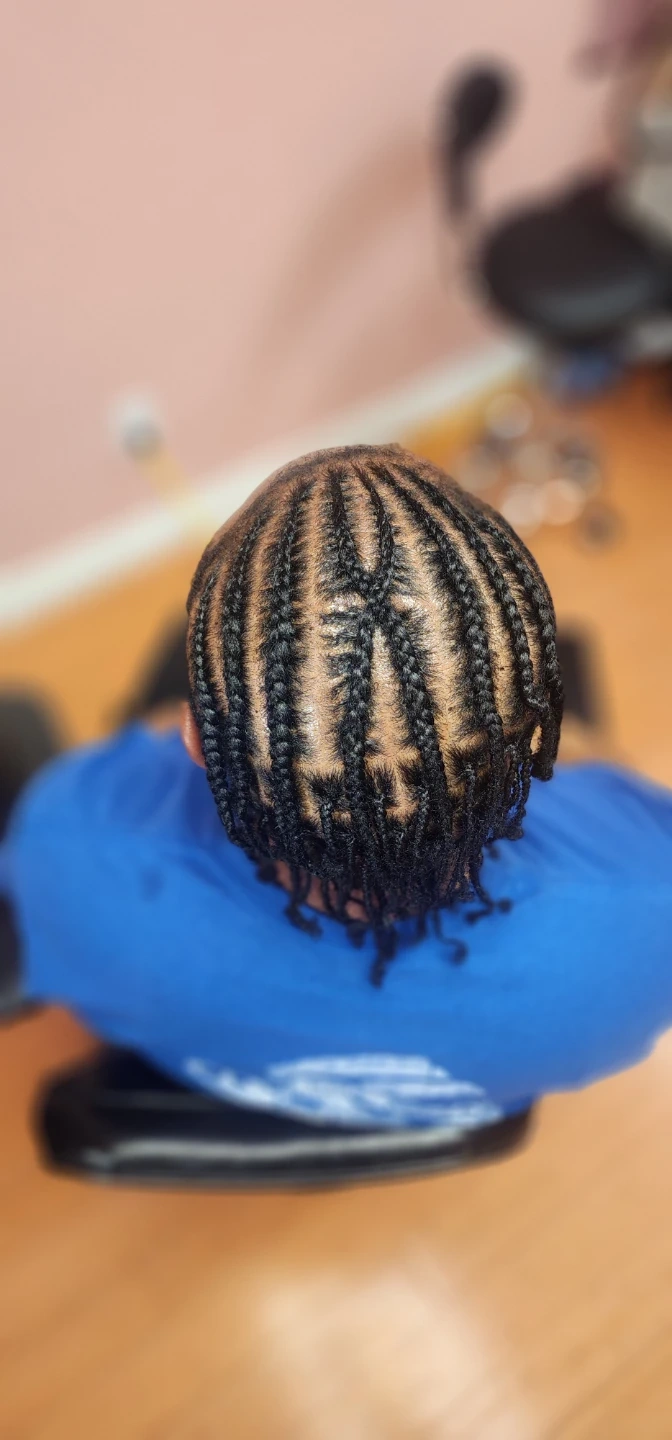 Freshly styled cornrows.This braiding service provides a neat and stylish look. Great for maintaining a sharp appearance for weeks!