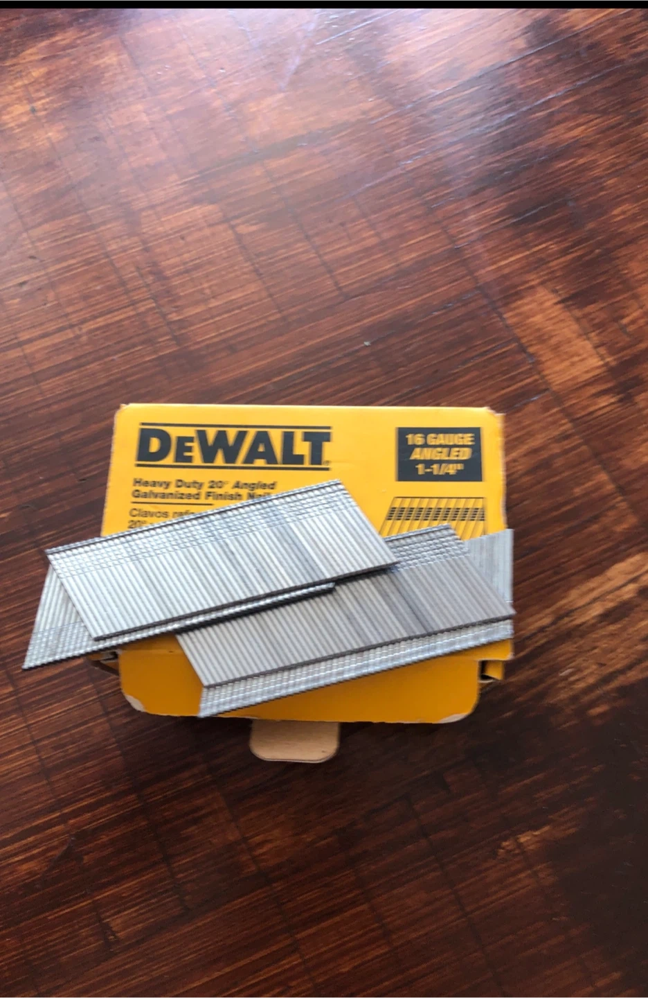 DeWalt Heavy Duty 20-gauge angled galvanized finish nails. These are 1-1/4 inches long. They're galvanized for corrosion resistance. These nails are useful for woodworking and construction projects.