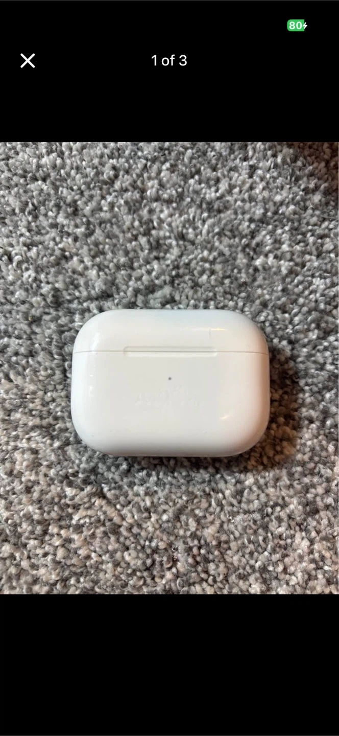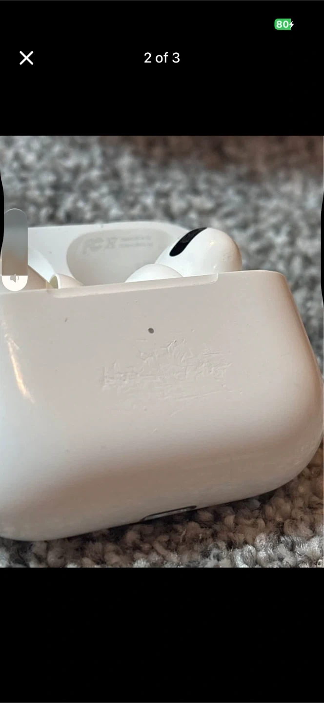 Apple AirPods Pro (1st Generation) with charging case. White colour. These earbuds offer active noise cancellation and transparency mode. They connect wirelessly via Bluetooth. They have scratches at the front