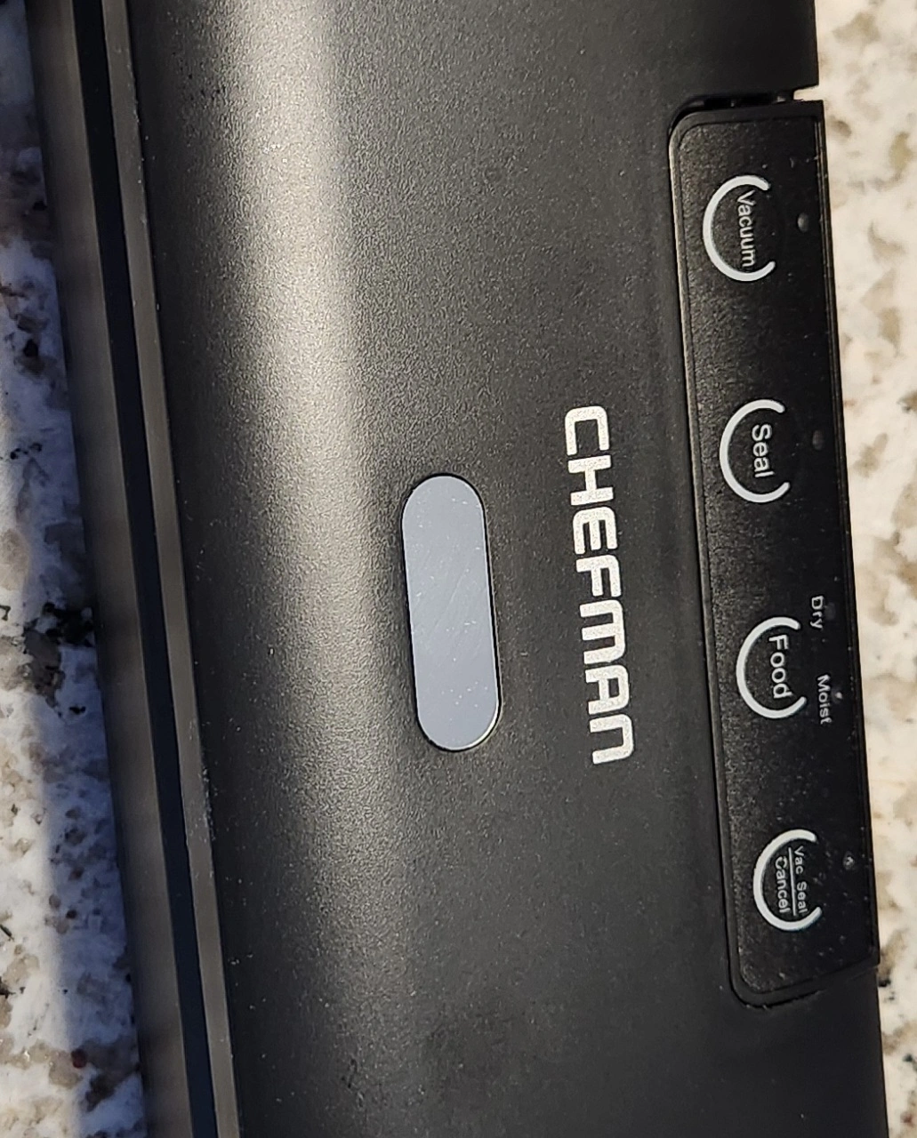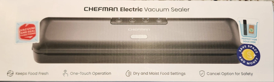 Brand new, never used CHEFMAN electric vacuum sealer. Keeps food fresh. One-touch operation. Dry and moist food settings. Cancel option for safety. Perfect for sous vide. Save space and money.