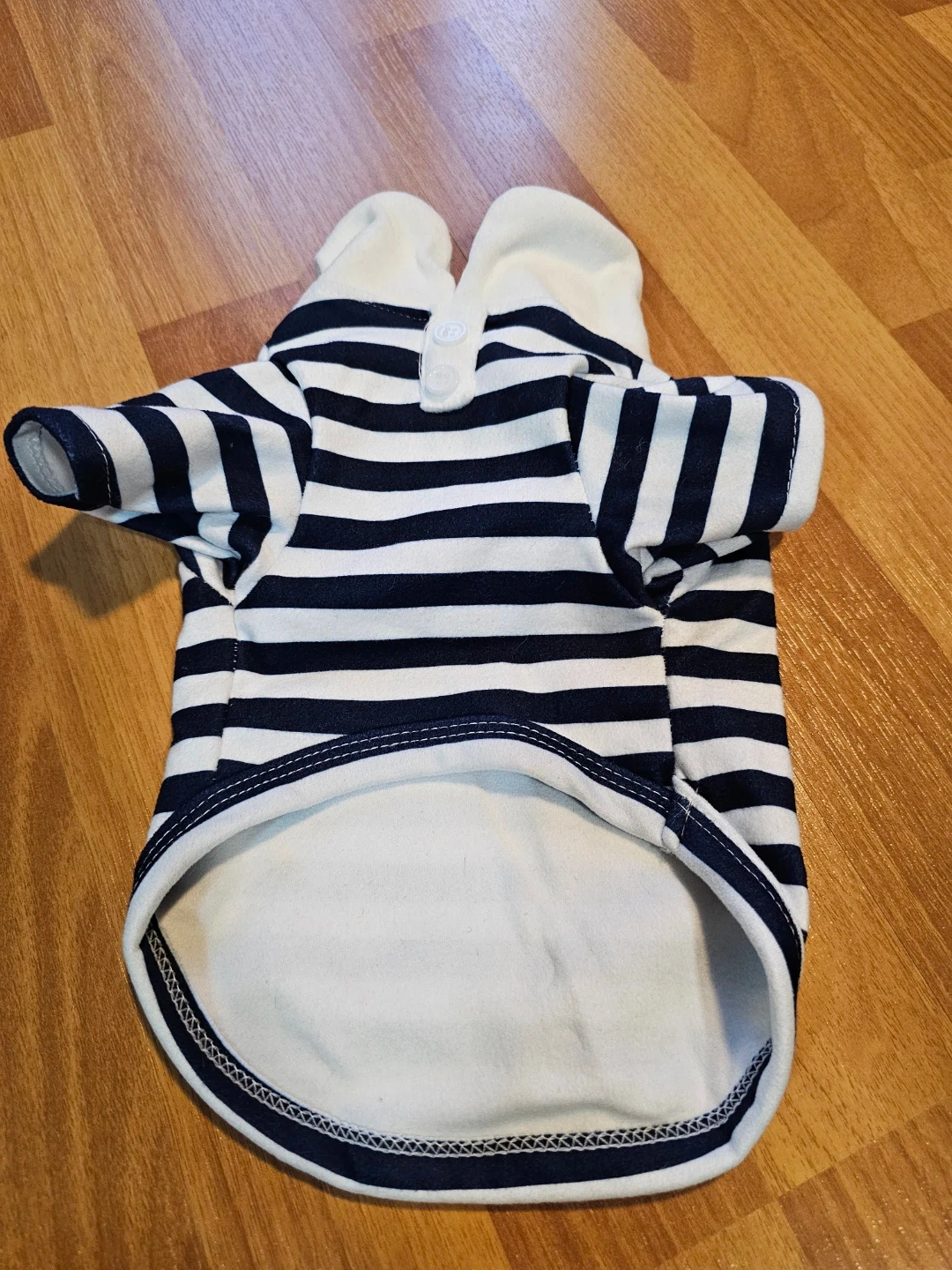 Polo Comfy striped pet shirt featuring a cozy turtleneck design. It's made of soft fabric for your pet's comfort. The shirt has two buttons at the back for easy dressing. Suitable for small to medium pets.