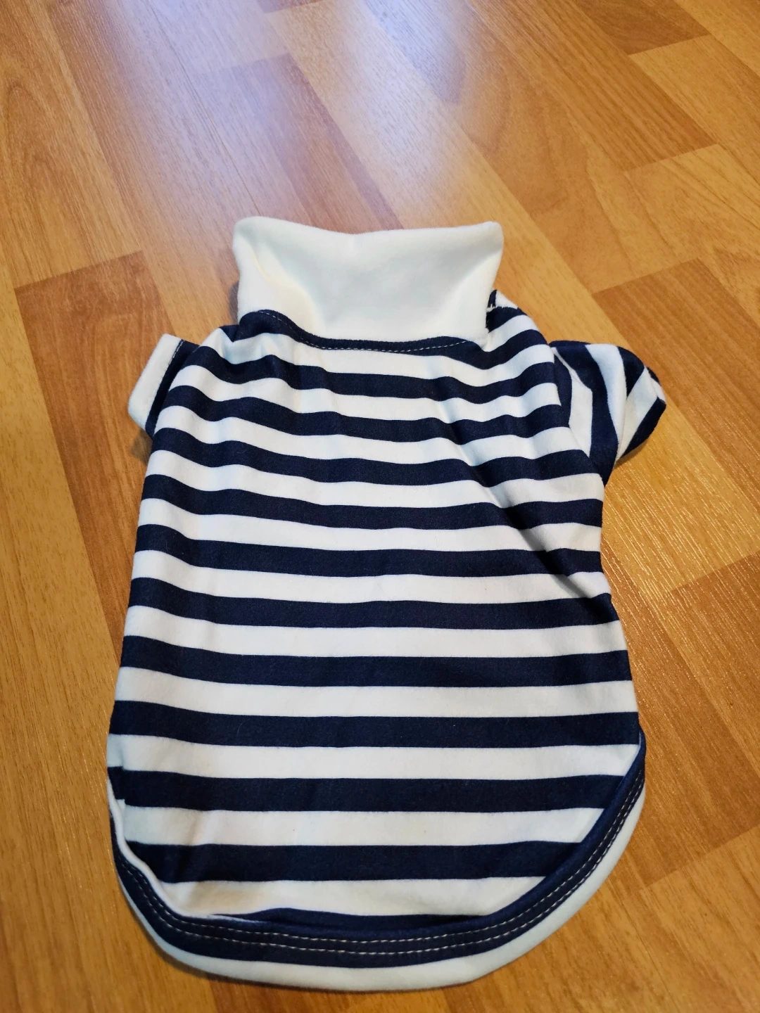 Polo Comfy striped pet shirt featuring a cozy turtleneck design. It's made of soft fabric for your pet's comfort. The shirt has two buttons at the back for easy dressing. Suitable for small to medium pets.