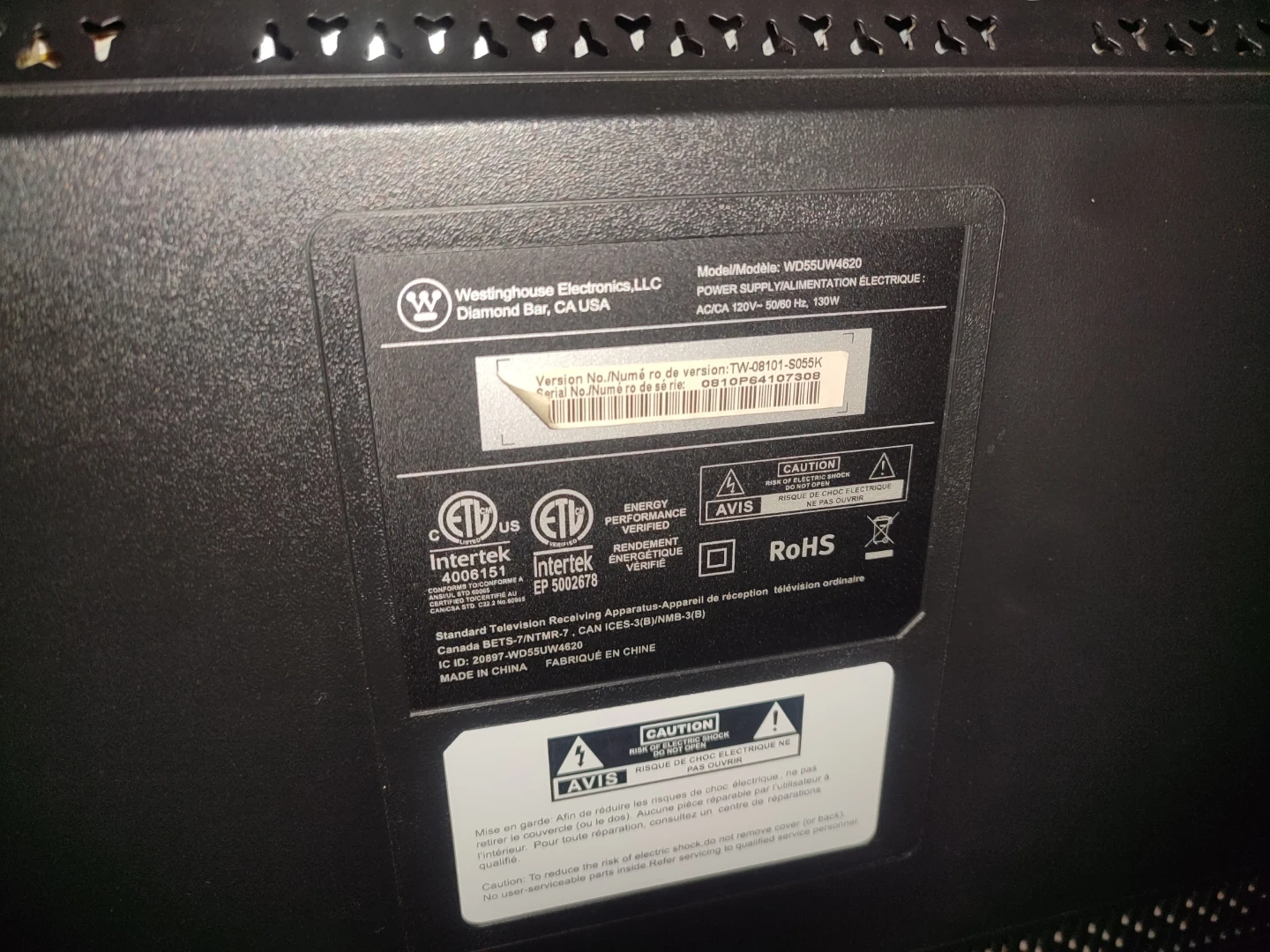 Westinghouse 55" Smart 4K TV (WD55UW4620) backlight issue.