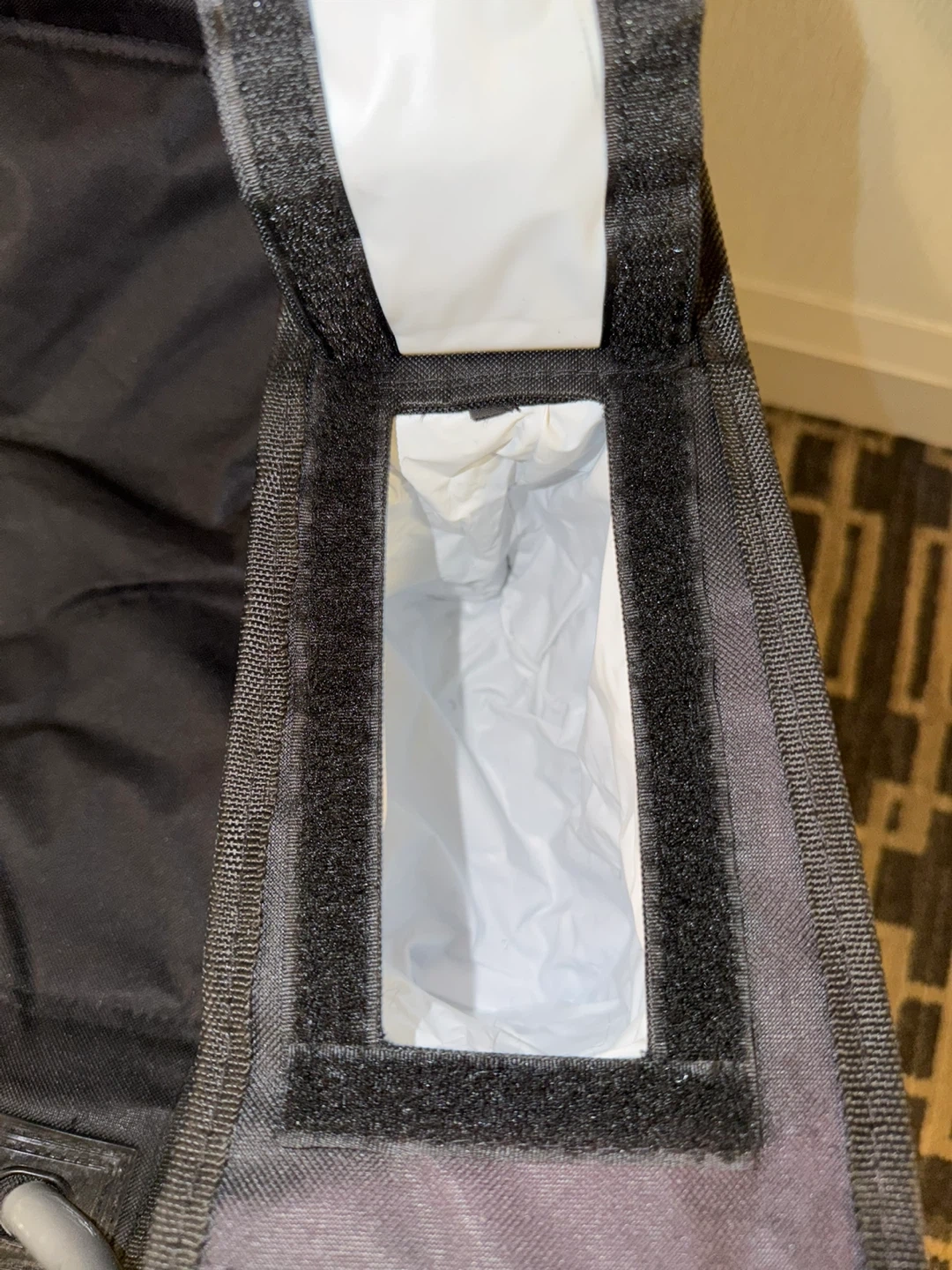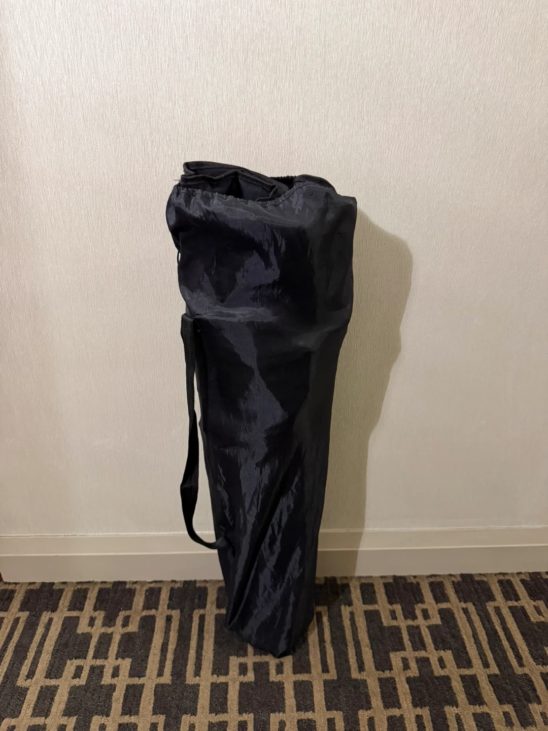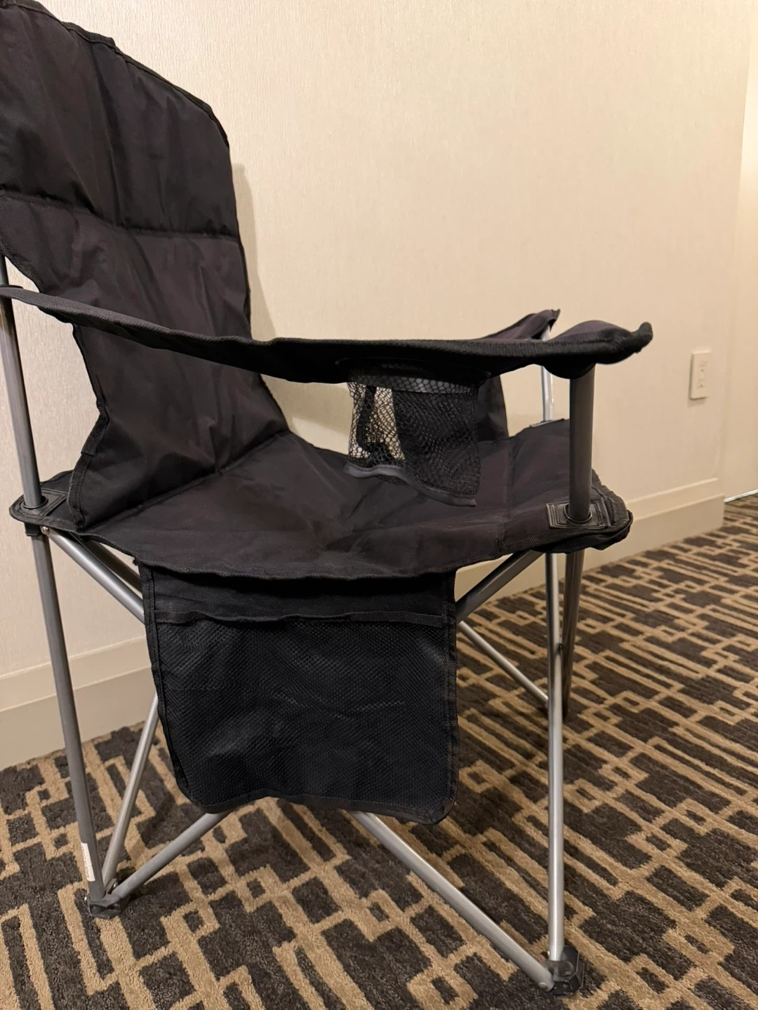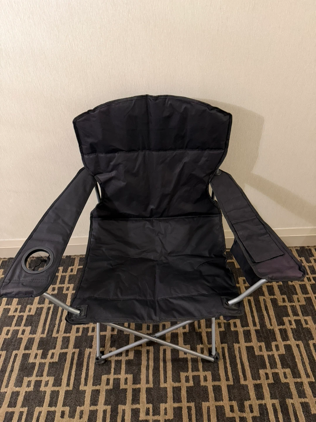 This black folding camping chair is great for outdoor adventures. It comes with a cup holder, a cooler pouch to keep drinks or food cold, and a storage pocket on the side. It's made of durable padded fabric and includes a carrying bag for easy transport. Used just a couple of times still clean and in like new condition.