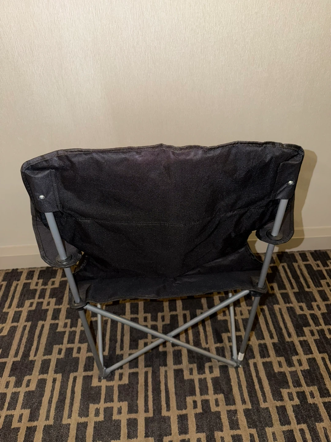 This black folding camping chair is great for outdoor adventures. It comes with a cup holder, a cooler pouch to keep drinks or food cold, and a storage pocket on the side. It's made of durable padded fabric and includes a carrying bag for easy transport. Used just a couple of times still clean and in like new condition.