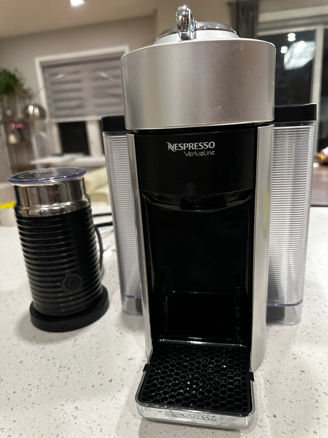 This is a Nespresso VertuoLine coffee machine. It features a sleek silver and black design. Includes a milk frother and two water tanks.