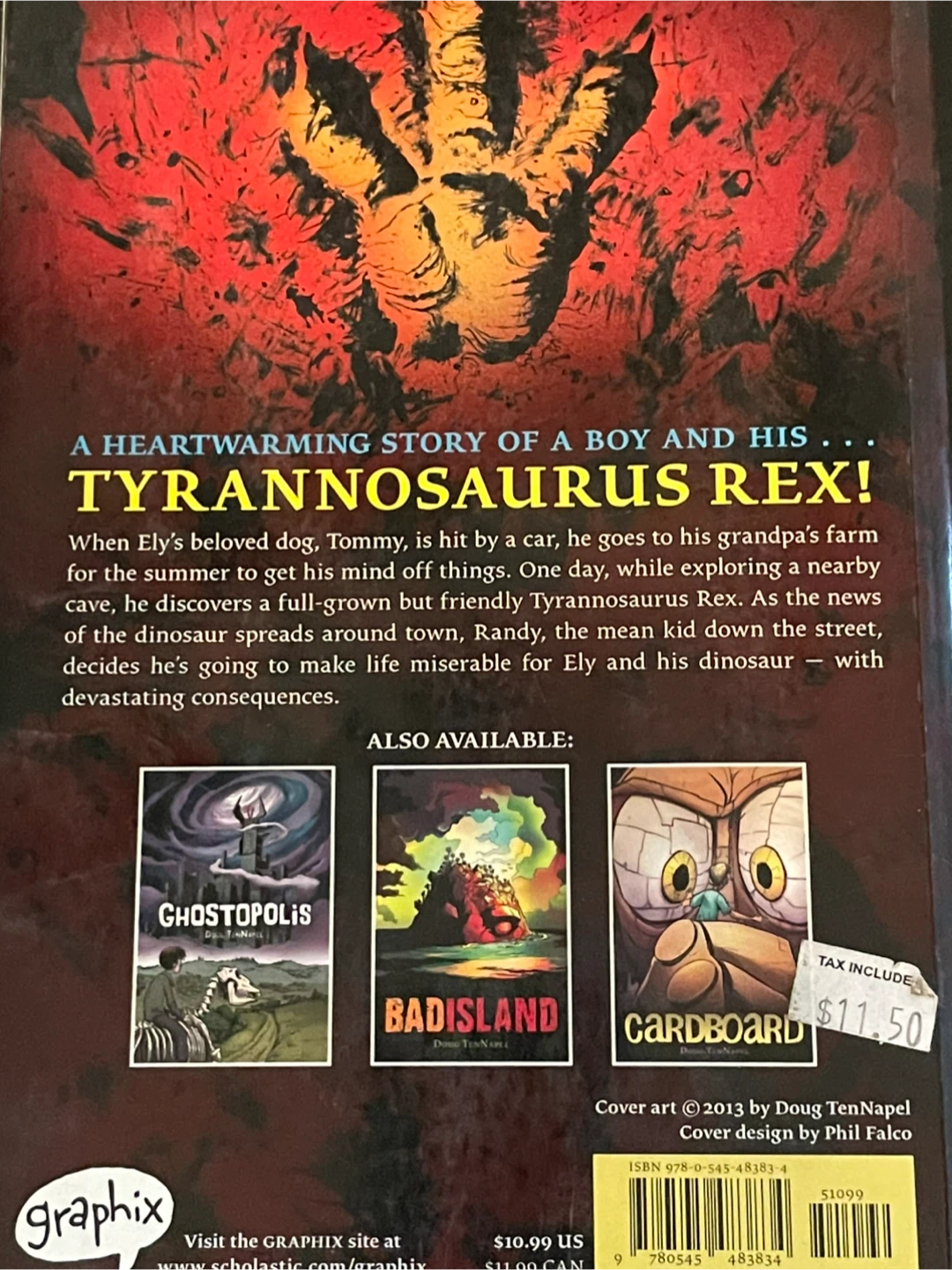 This is the graphic novel Tommysaurus Rex by Doug TenNapel. It's a heartwarming story about a boy and his dinosaur. Cover art by Doug TenNapel and cover design by Phil Falco.