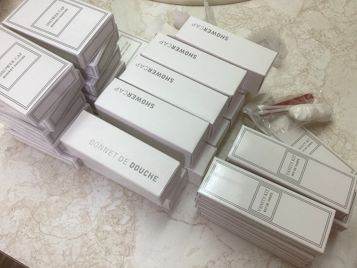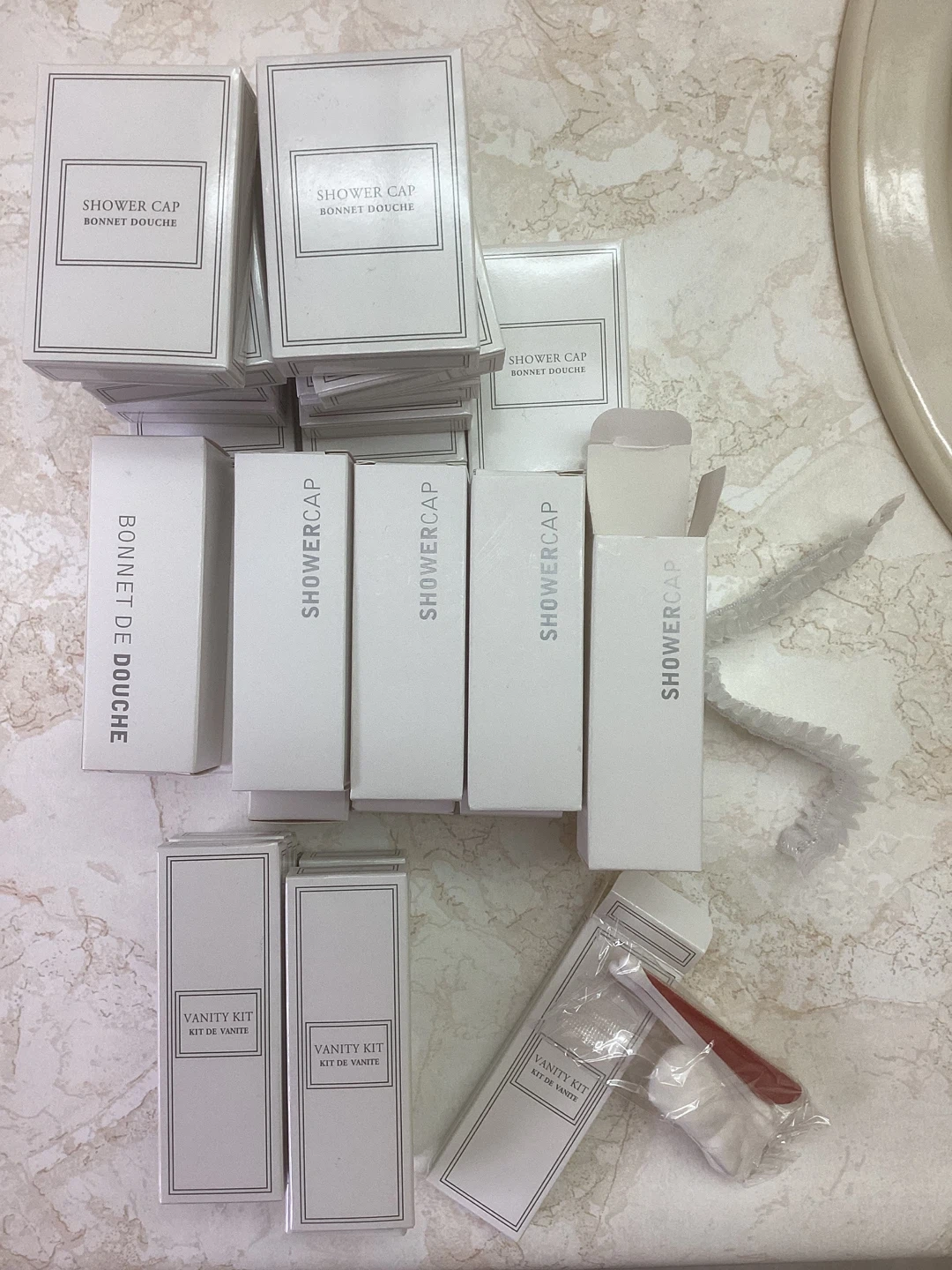 Includes multiple individually packaged shower caps (21) and vanity kits (9). Each vanity kit contains cotton swabs and a nail file. Great for hotels or travel! Pick up near Scarborough UofT campus (Conlins and Ellesmere)