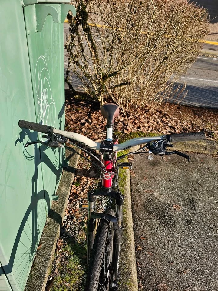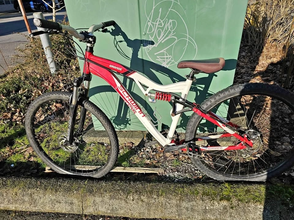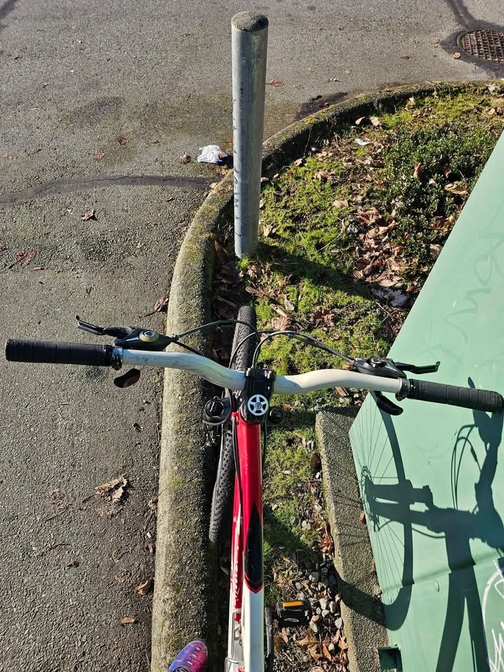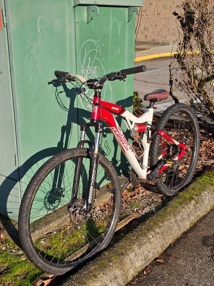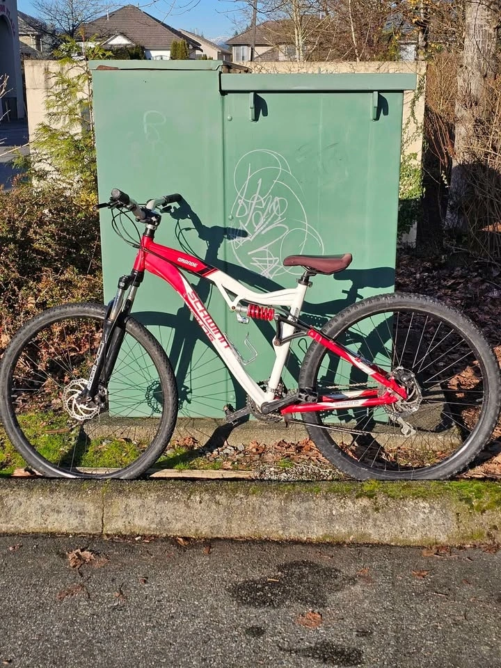 Selling a Schwinn Grande full-suspension mountain bike in good overall condition. Features full suspension (front & rear), disc brakes, and a Shimano drivetrain. It has a strong frame and straight wheels, making it suitable for city riding and light trails. The bike is in good working order overall, though the front gears need adjustment and the rear brake needs tightening. Shows cosmetic wear consistent with normal use. Bike is rideable and sold as-is. Price is $190 OBO. Pickup in Coquitlam. Cash only.