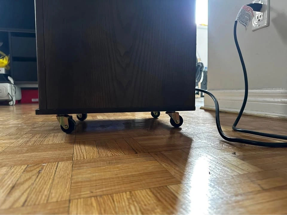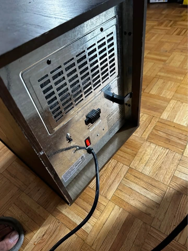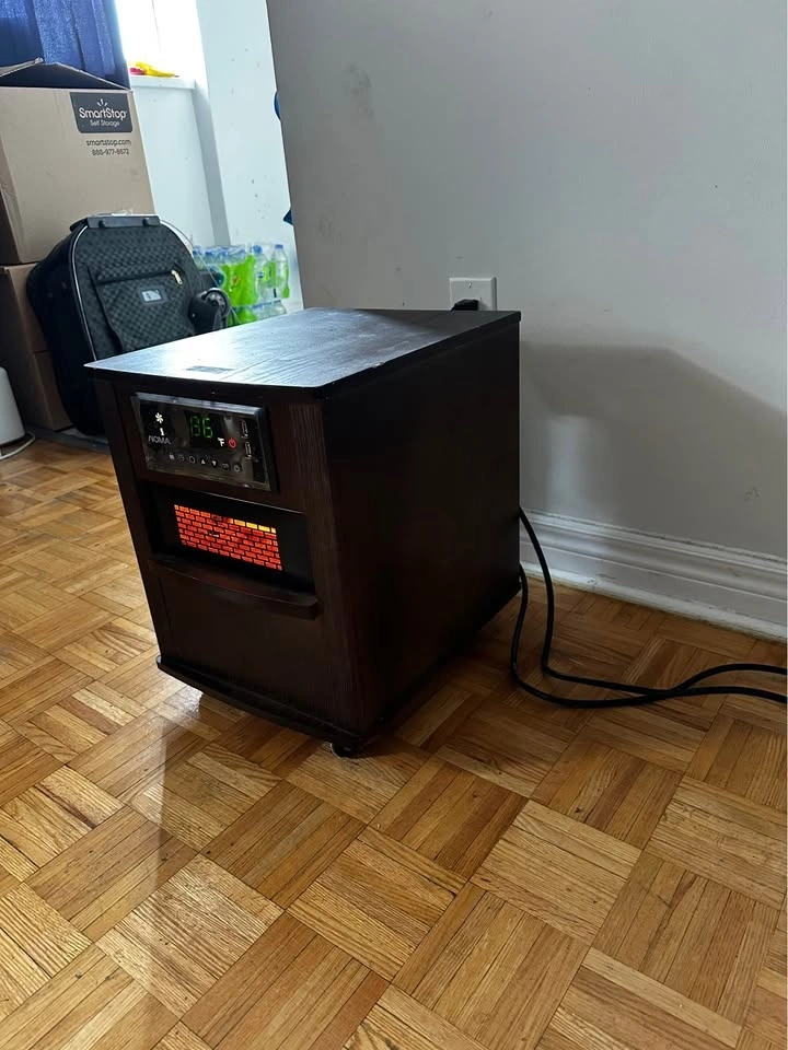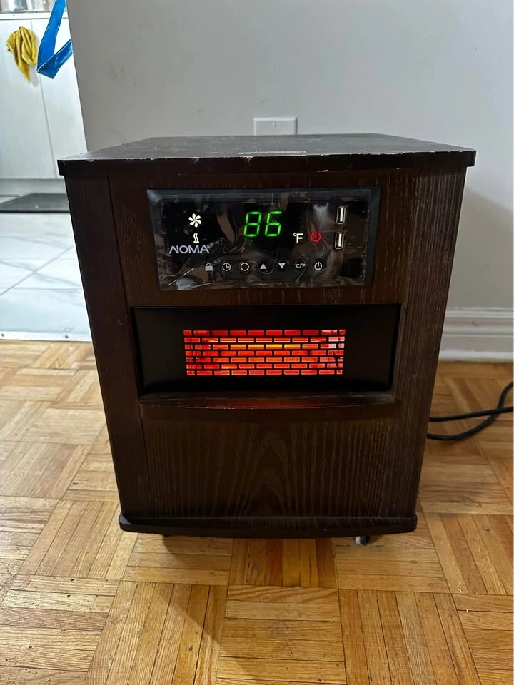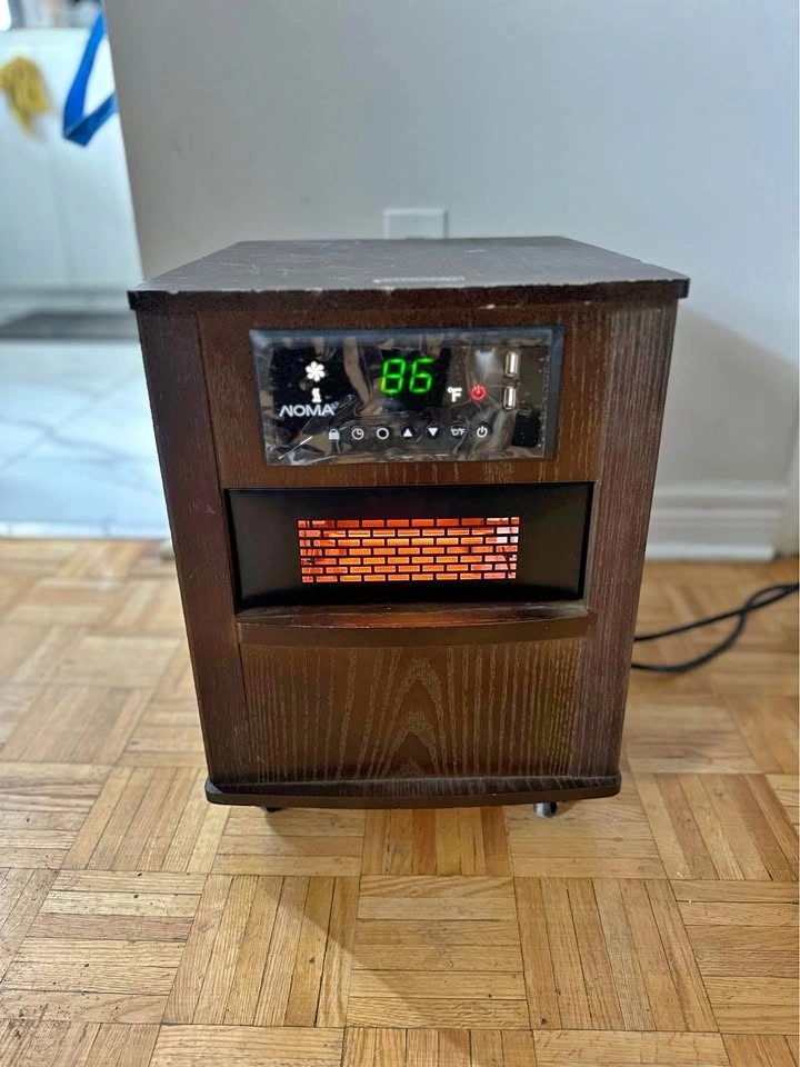 Portable NOMA infrared space heater. Dark brown wood-grain finish. Digital display. Heating element works, glowing orange. On wheels for easy moving. Great for extra warmth. Pick up near Bloor and Parliament.