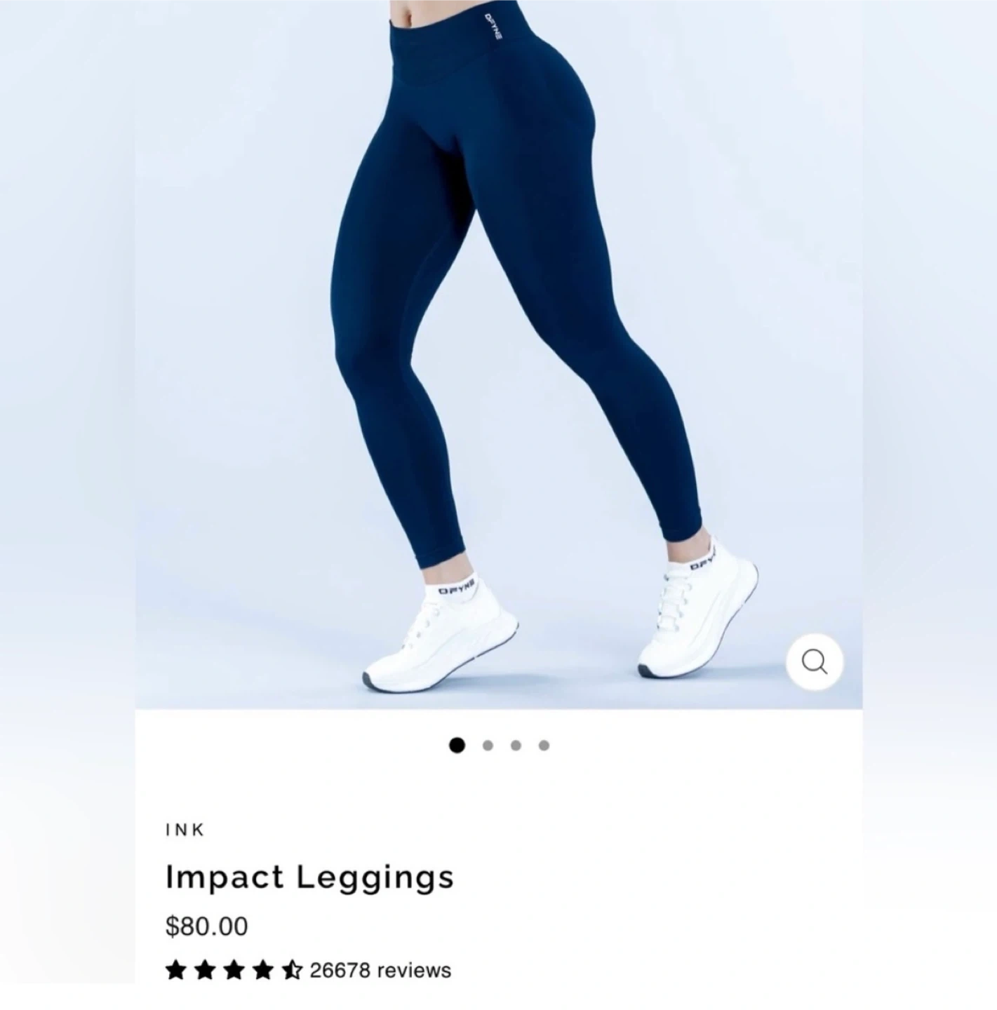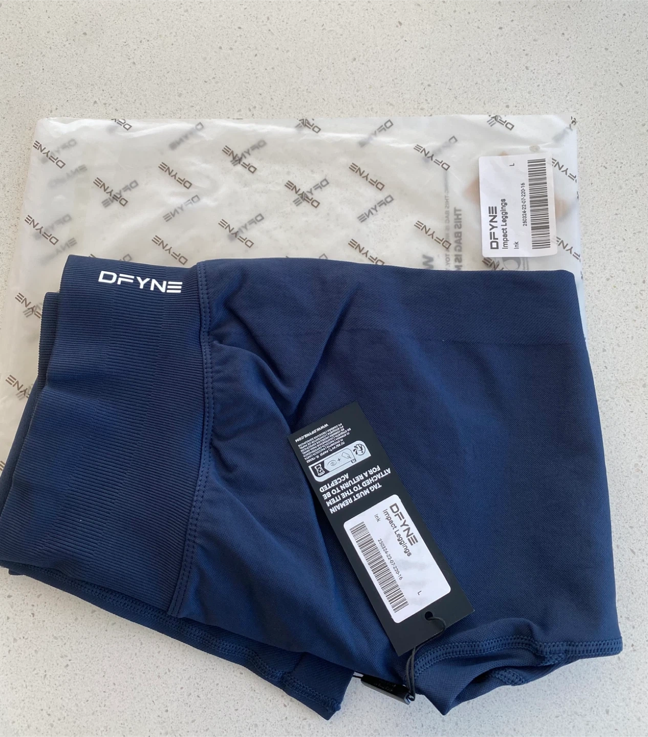 Stylish DFYNE Impact leggings. Color is ink, a deep navy blue. High-waisted design. Great for active wear. Seamless design, super smooth feel. Good for gym or just lounging around.