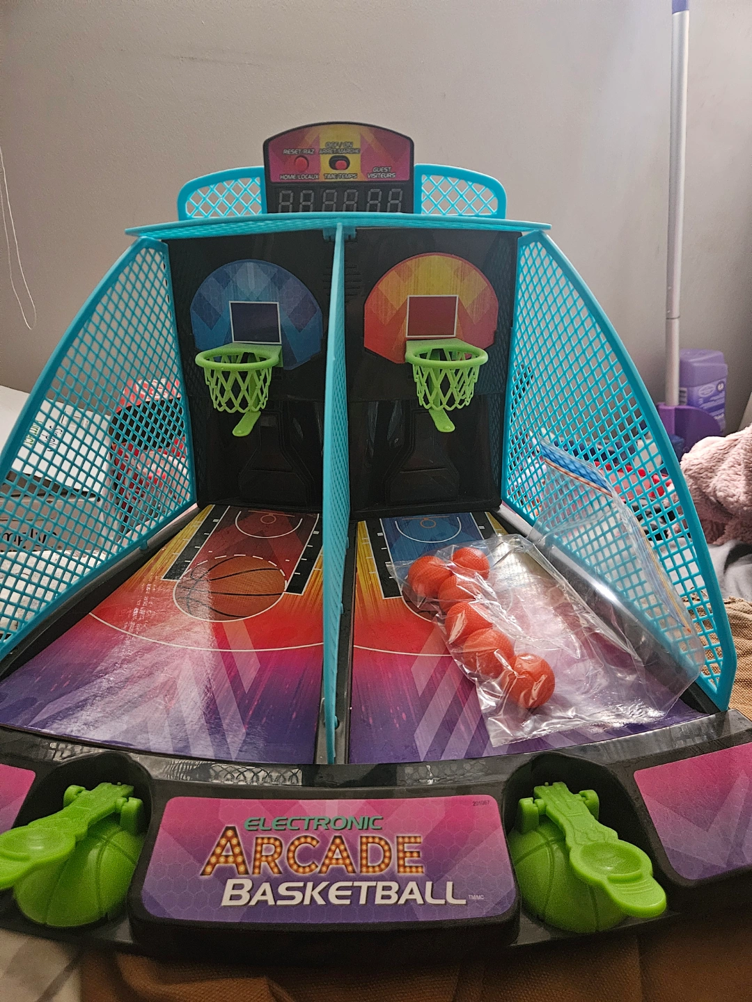 Miniature arcade-style basketball game. Features two hoops, a digital scoreboard, and shooting mechanisms. Includes 6 small orange basketballs. Playing with friends or family would be a great way to unwind.