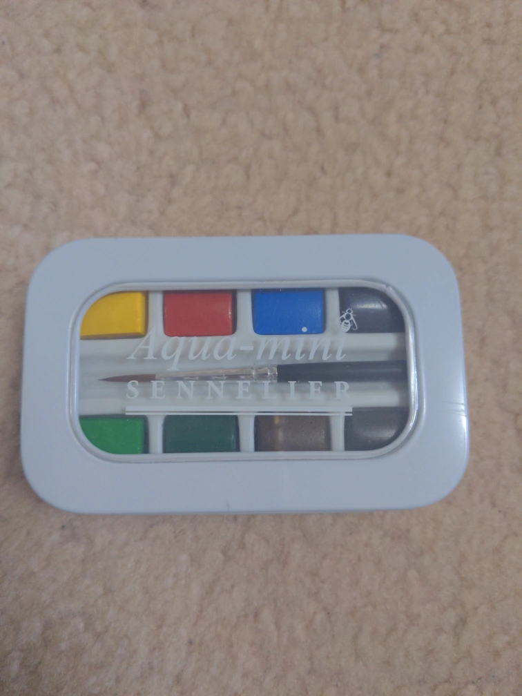 This is a Sennelier Aqua-Mini watercolour paint set. It includes 8 vibrant colours and a brush. New.