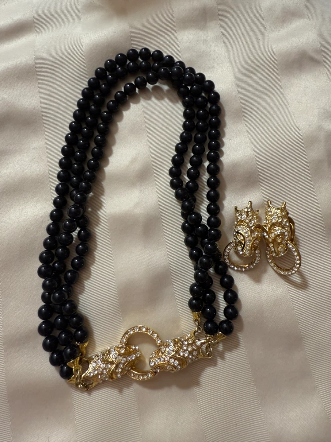 Here's a lovely beaded necklace and earrings set! The necklace features black beads and gold-tone clasps with a unique design. The matching earrings complement the necklace perfectly. A great addition to any jewelry collection!