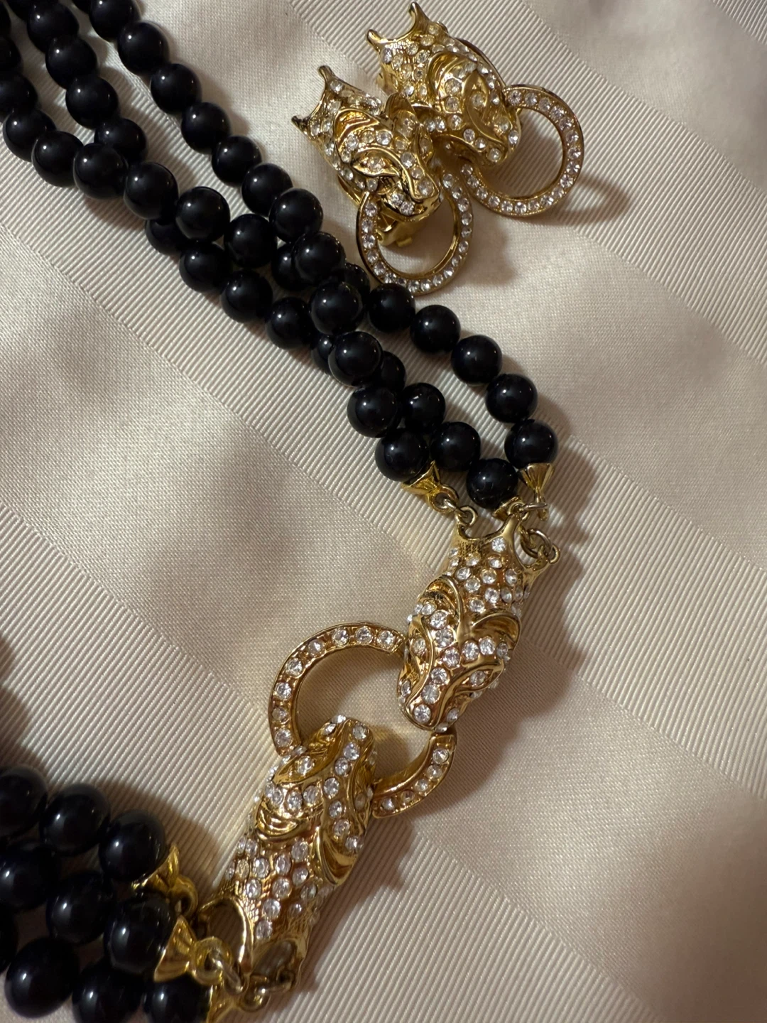 Here's a lovely beaded necklace and earrings set! The necklace features black beads and gold-tone clasps with a unique design. The matching earrings complement the necklace perfectly. A great addition to any jewelry collection!