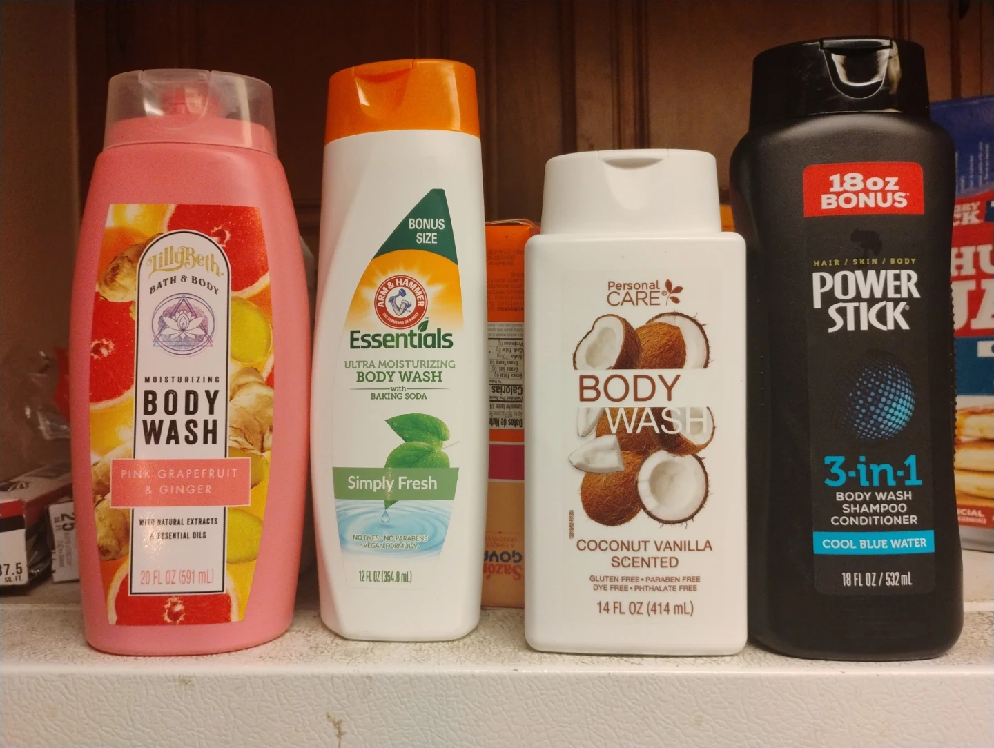 One Lilly Beth Pink Grapefruit & Ginger Moisturizing Body Wash (20 FL OZ). One Arm & Hammer Essentials Ultra Moisturizing Body Wash (12 FL OZ). Both bottles are full size.