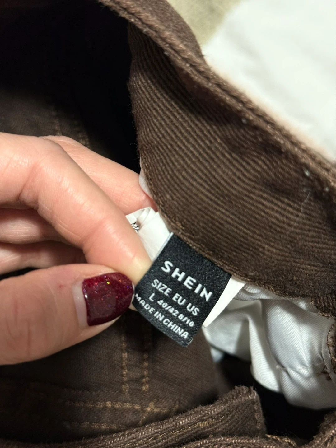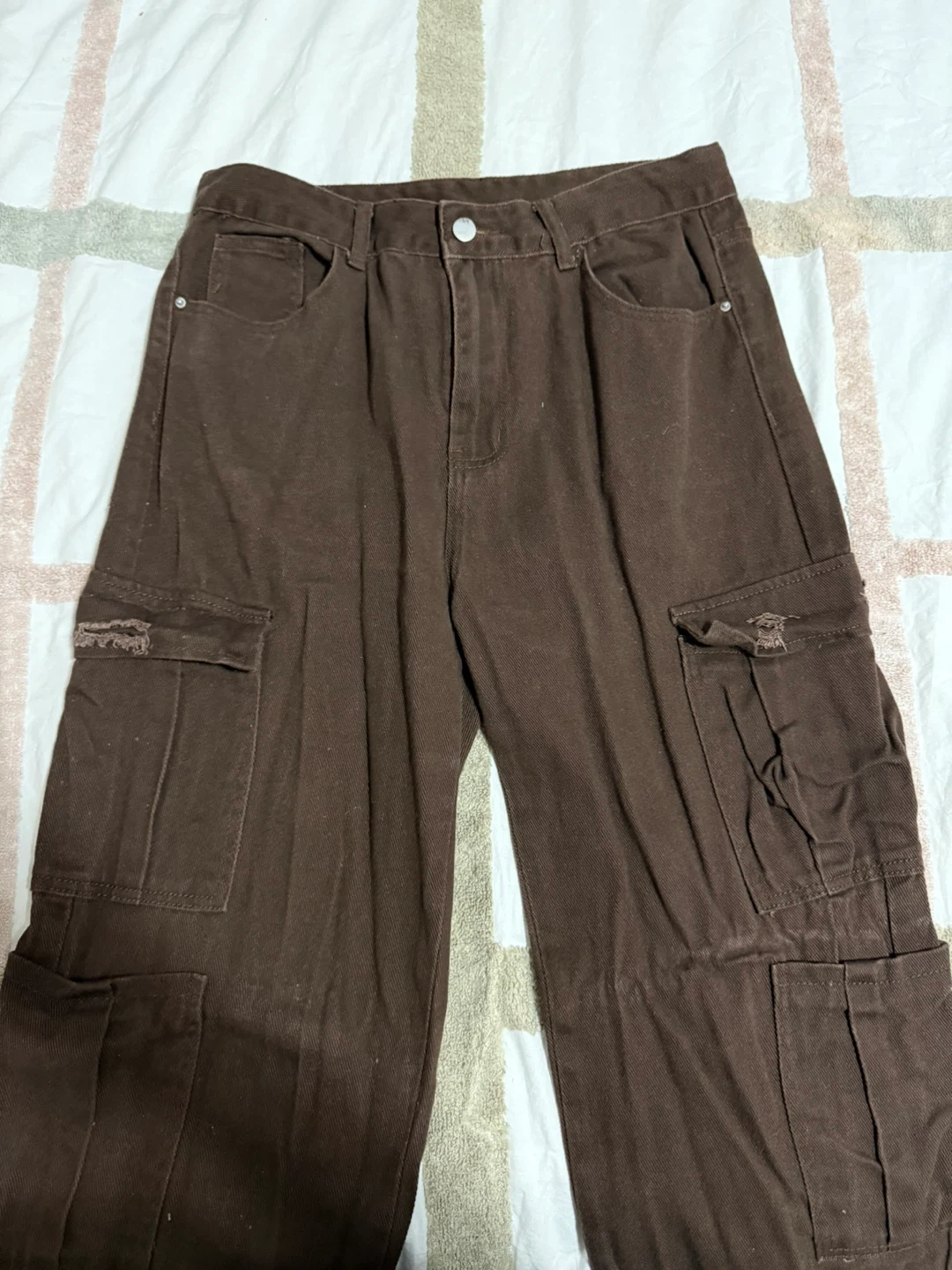Selling a pair of brown cargo pants from Shein in size L, with some ripped details. Amazing condition.
