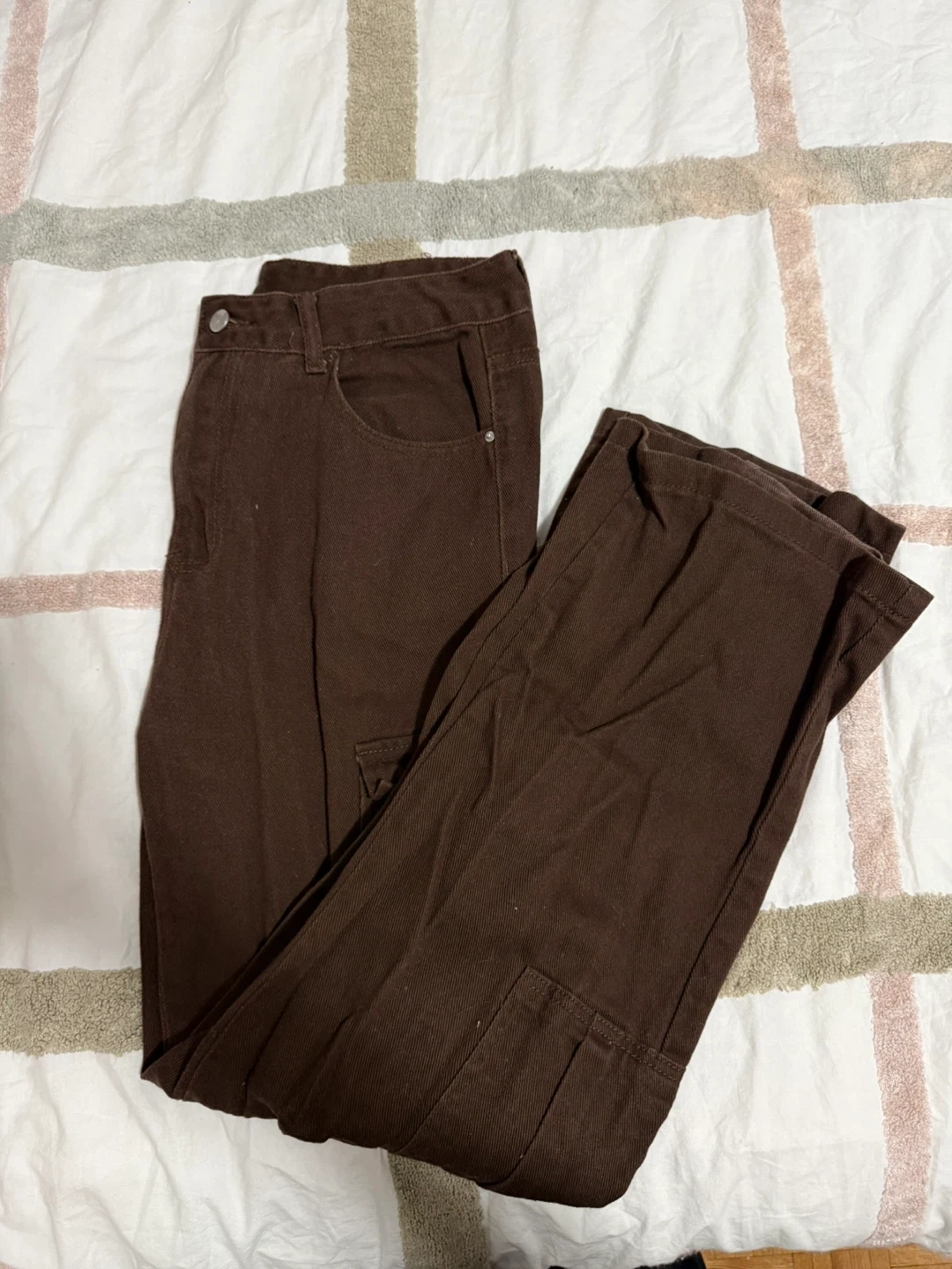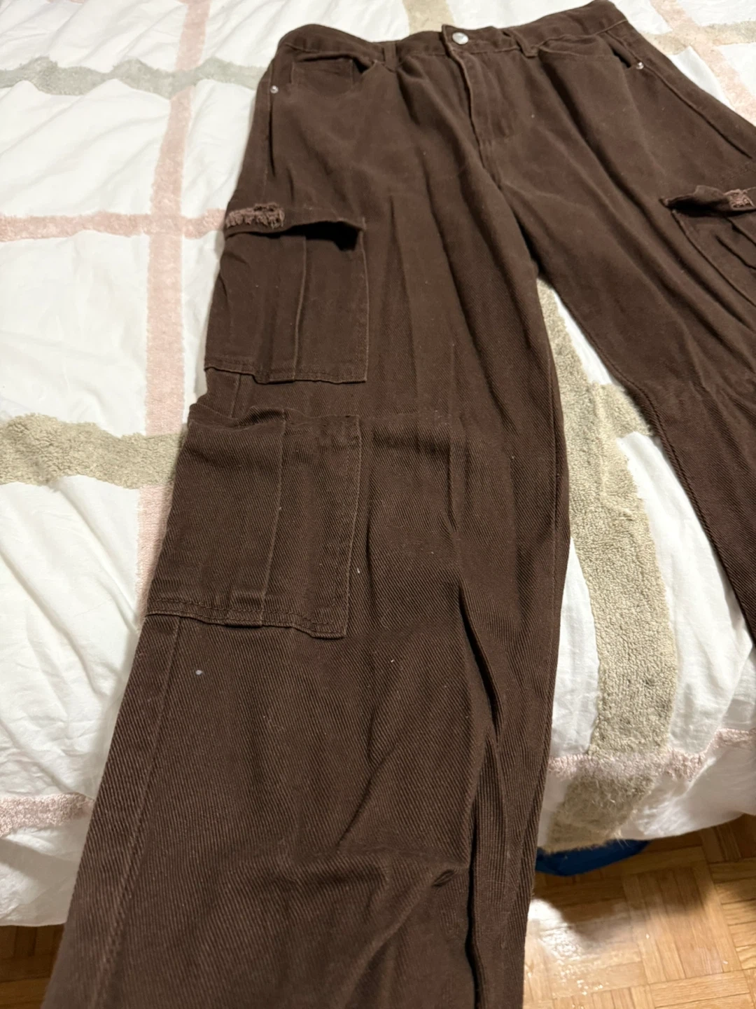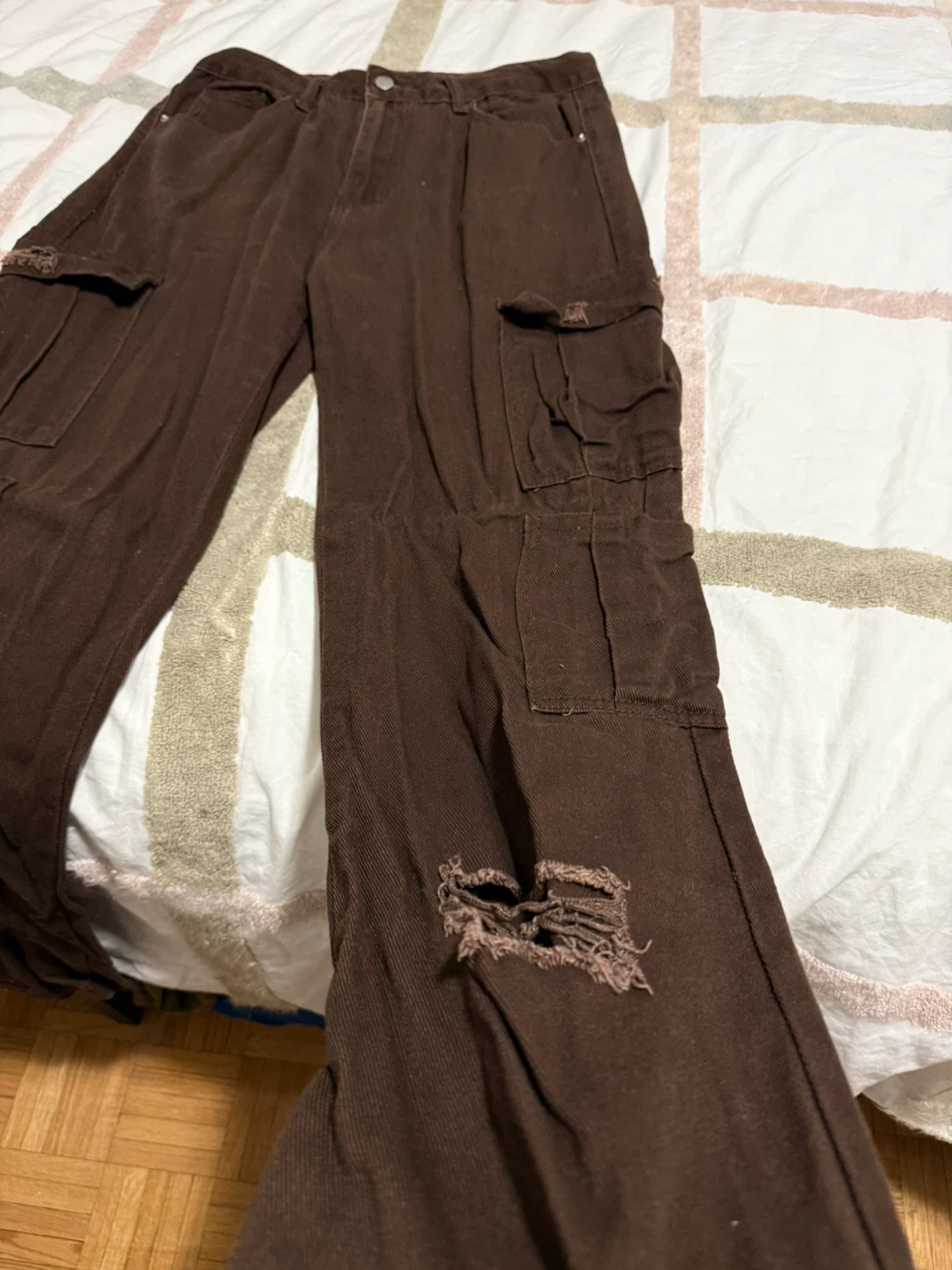 Selling a pair of brown cargo pants from Shein in size L, with some ripped details. Amazing condition.