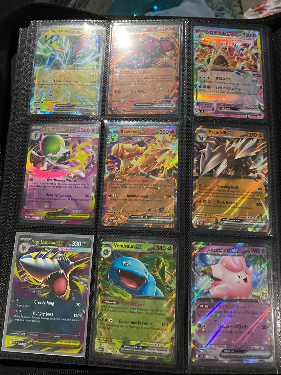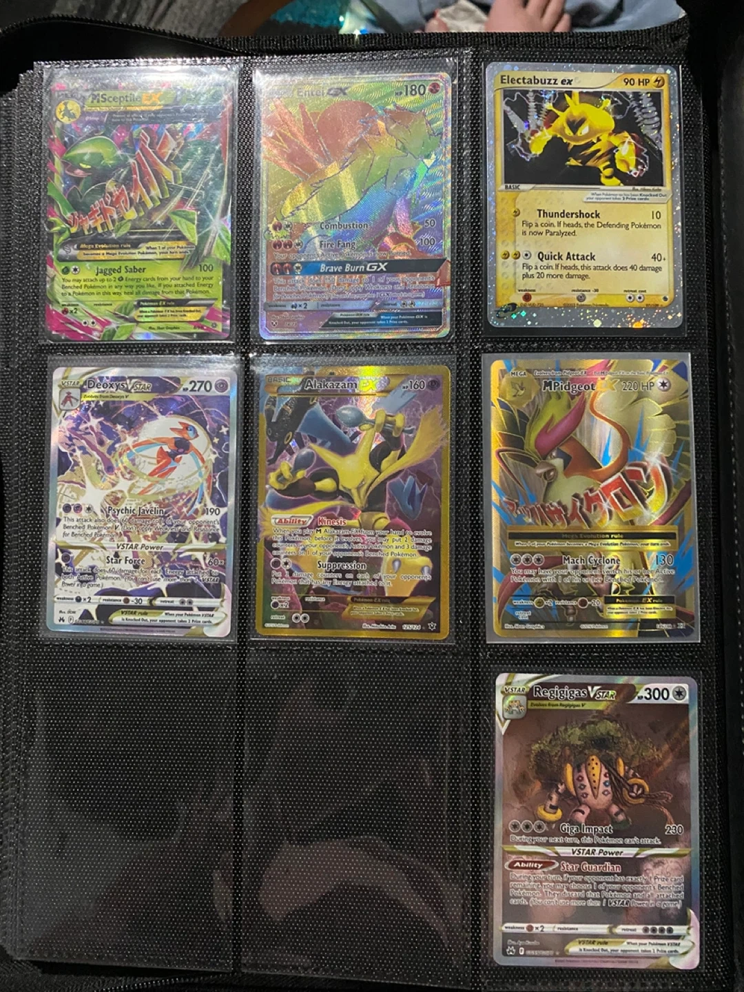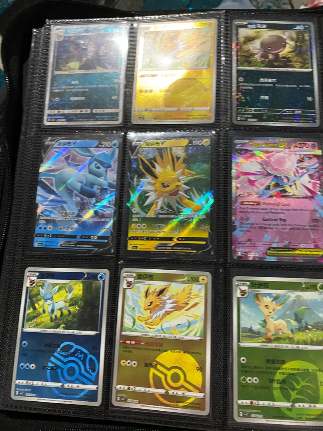 A collection of various Pokémon trading cards featuring different creatures and attacks. These cards are great for collectors and players alike. Some cards are holographic and include characters like Jolteon, Vaporeon, and Flareon.