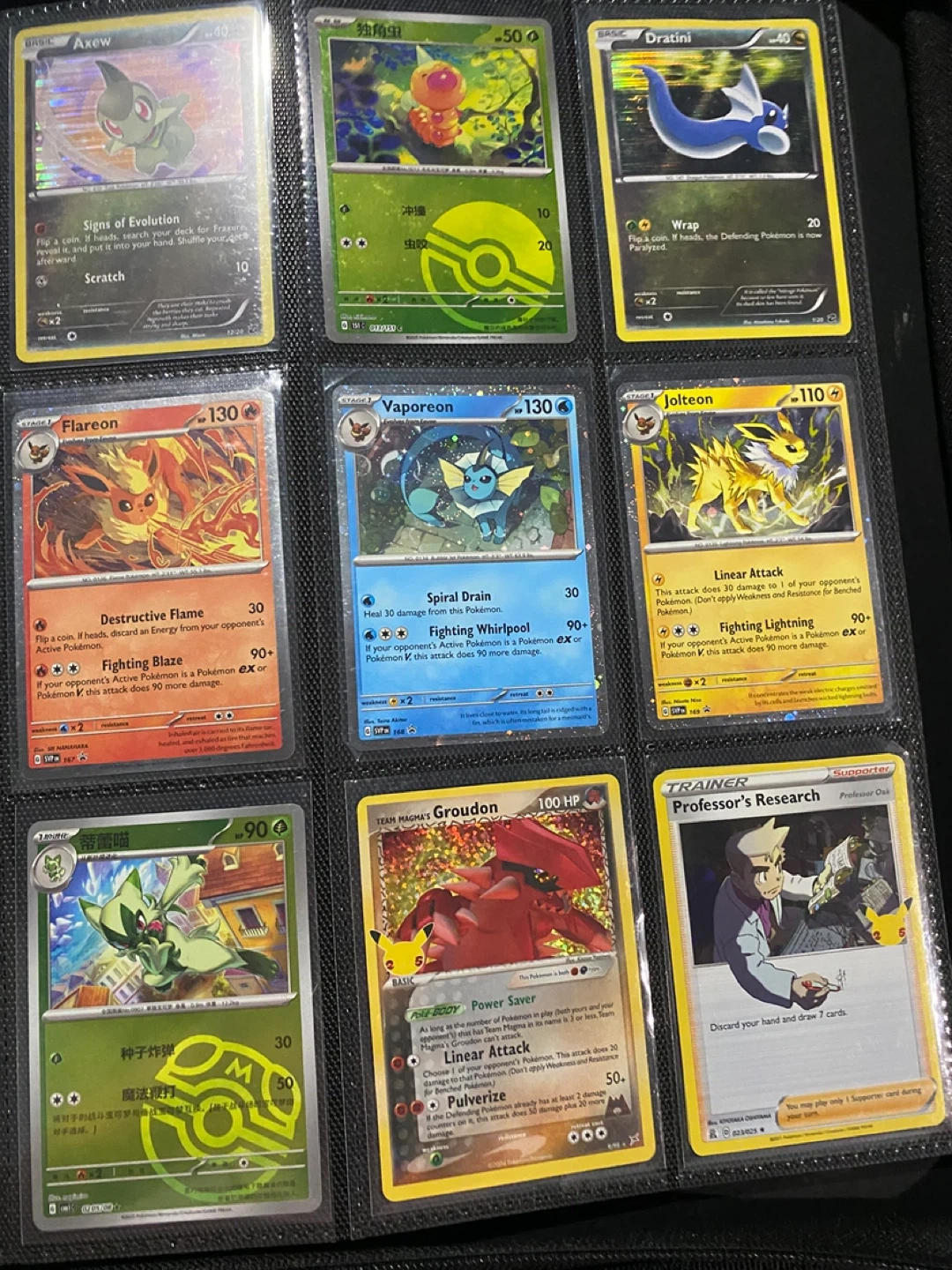 A collection of various Pokémon trading cards featuring different creatures and attacks. These cards are great for collectors and players alike. Some cards are holographic and include characters like Jolteon, Vaporeon, and Flareon.
