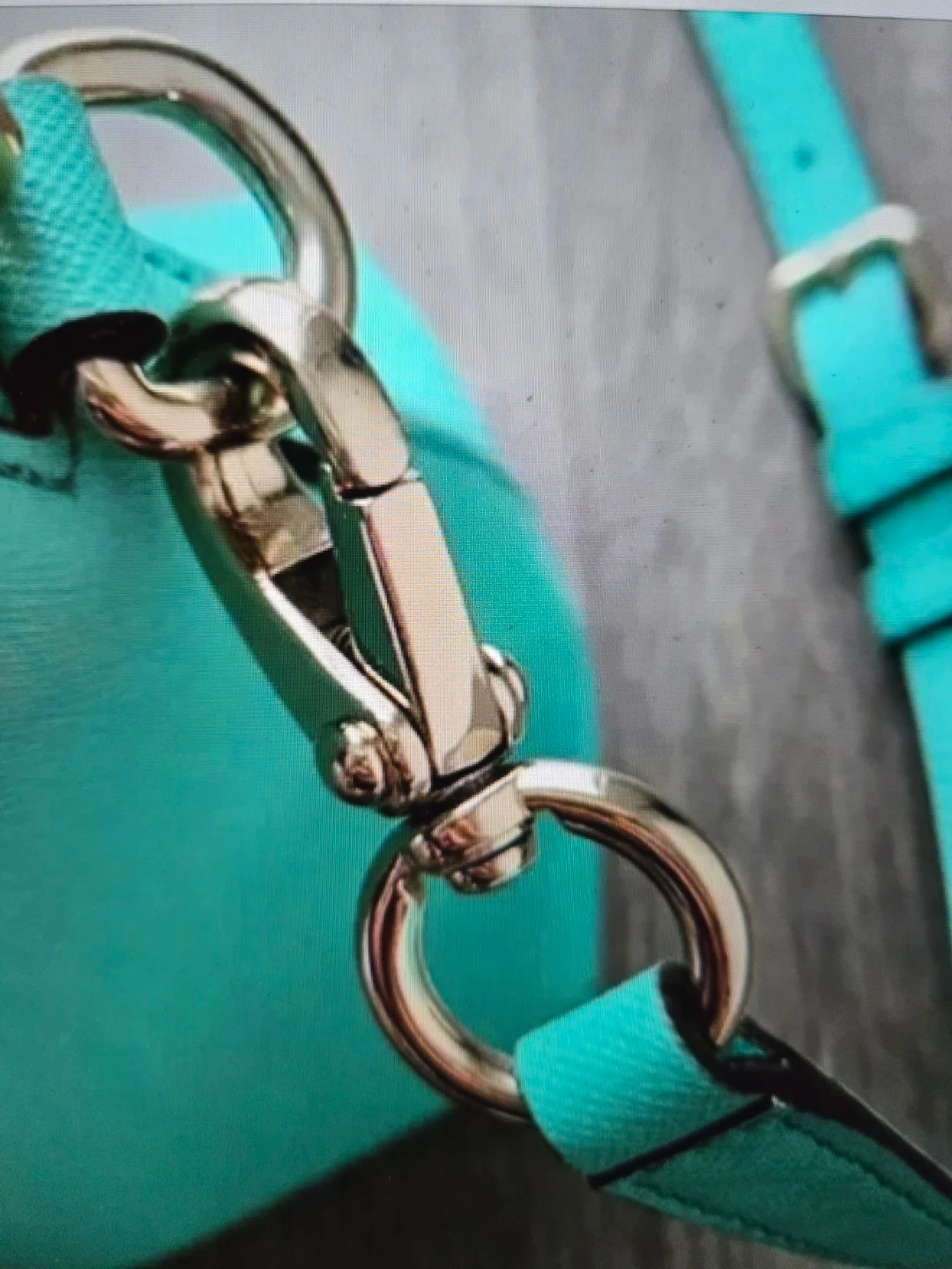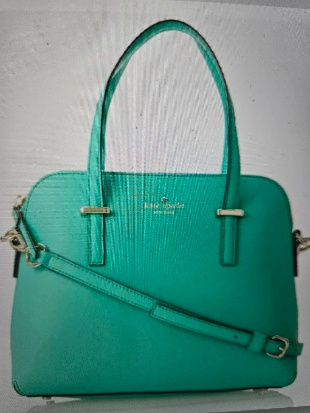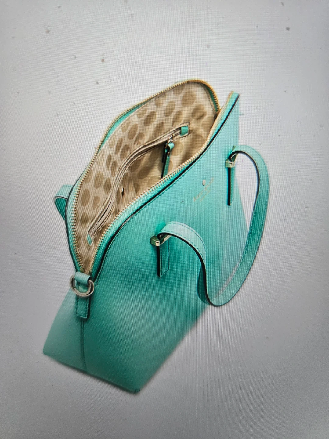 A lovely turquoise Kate Spade handbag. It features Saffiano (hatched) leather, gold plated hardware, and has top handles with a detachable crossbody strap. Includes a zippered top closure for security and a gorgeous champagne polka dot silky interior lining! Like new condition with some shaping needed from being in storage.