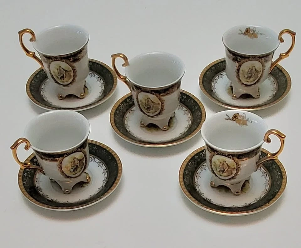 This Lordshade teacup and saucer set features a Dancy Italian Design. Each cup and saucer has a decorative gold trim and a charming scene. Includes five cups and five saucers.