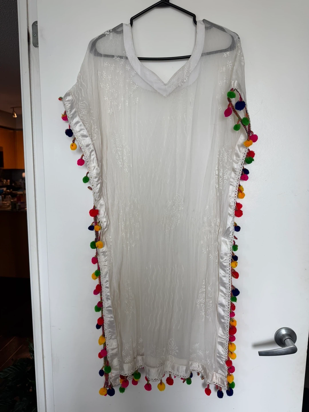 A flowy white sheer kaftan dress with a V-neckline. It's adorned with a colourful pom-pom trim along the edges. Perfect for layering over swimwear.