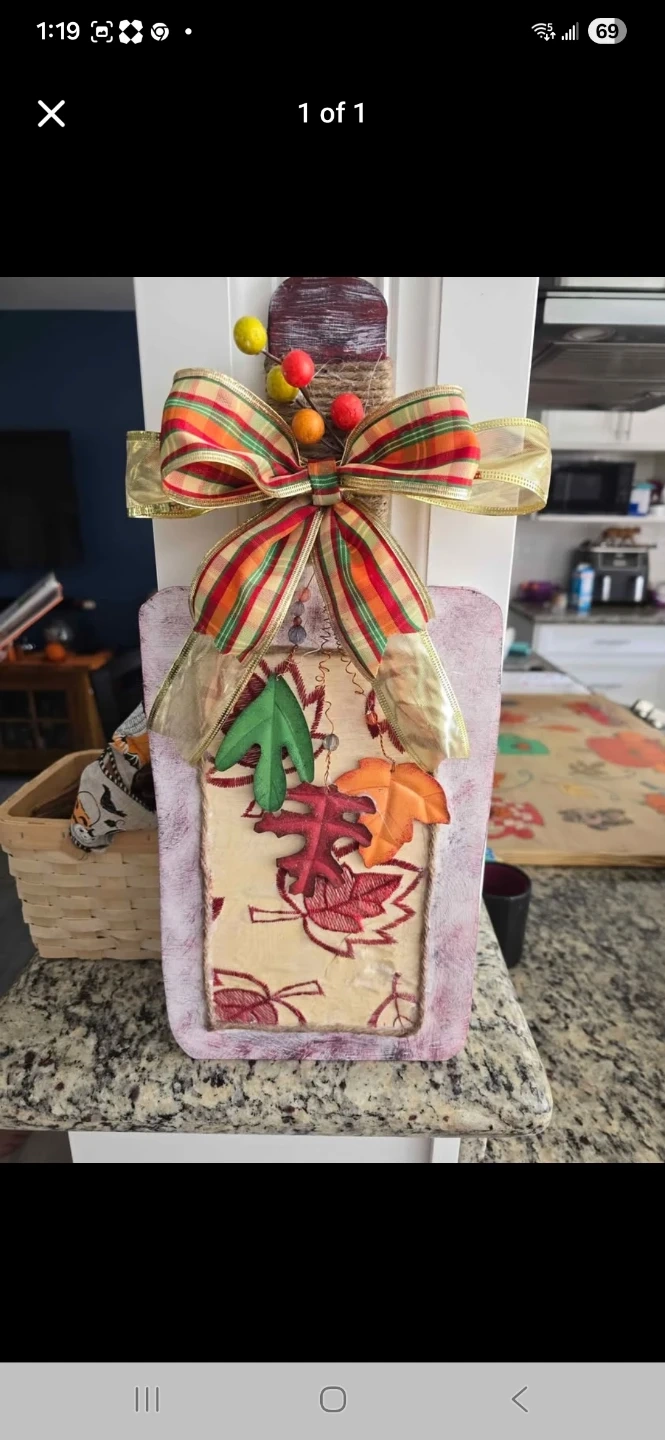 This decorative sign features a rustic design with autumn leaves and a plaid ribbon bow. It's embellished with twine and berry accents. Adds a touch of fall to your home decor!