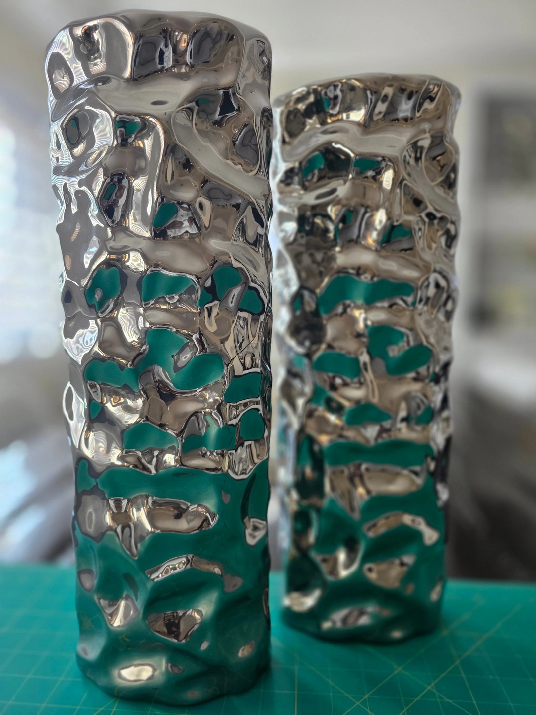 ✨Beautiful set of two matching 18-inch silver decorative vases. These pieces feature a striking sculptural textured design with a reflective metallic finish and subtle teal undertones in the recessed areas. They catch light beautifully and add a bold, modern statement to any room.