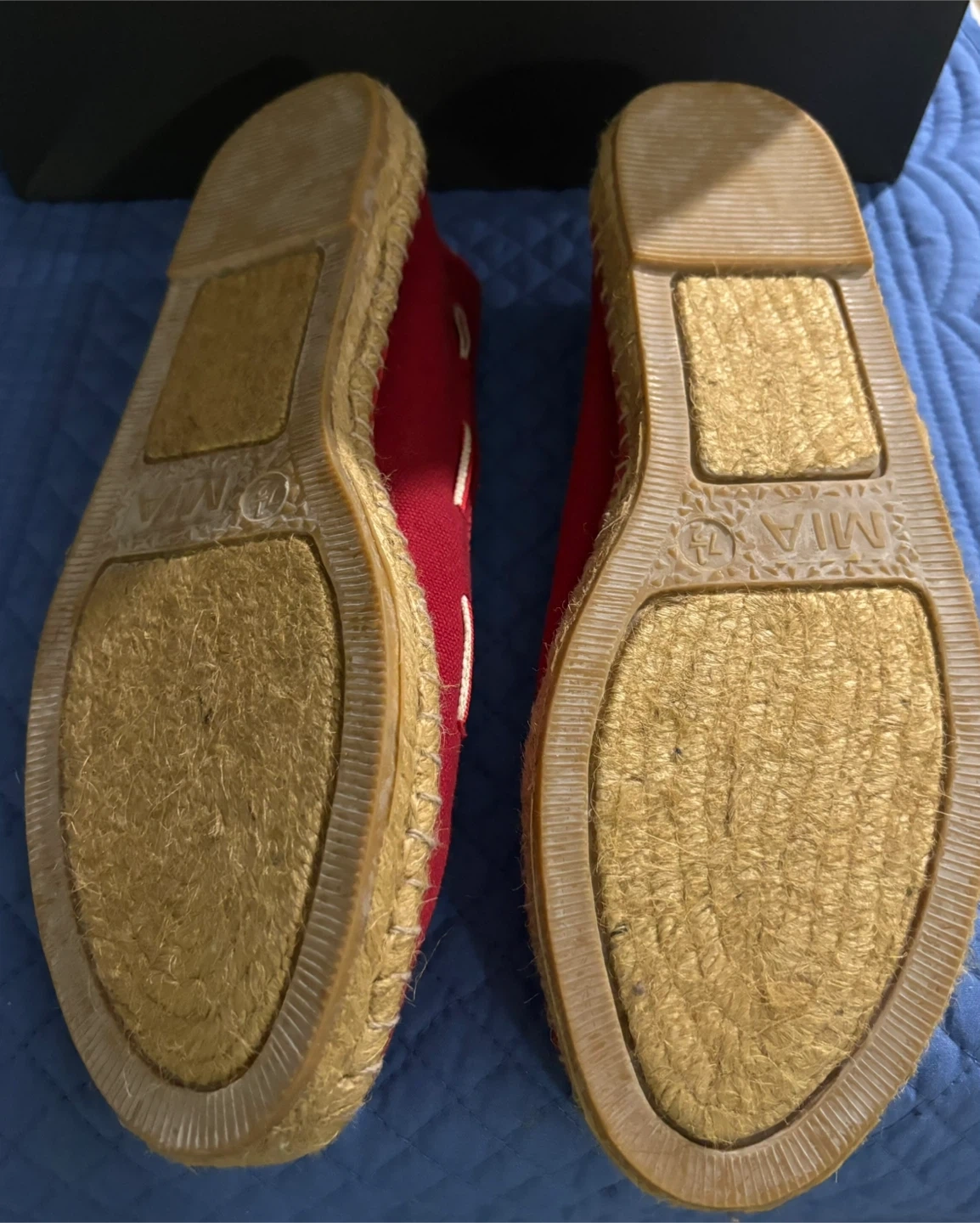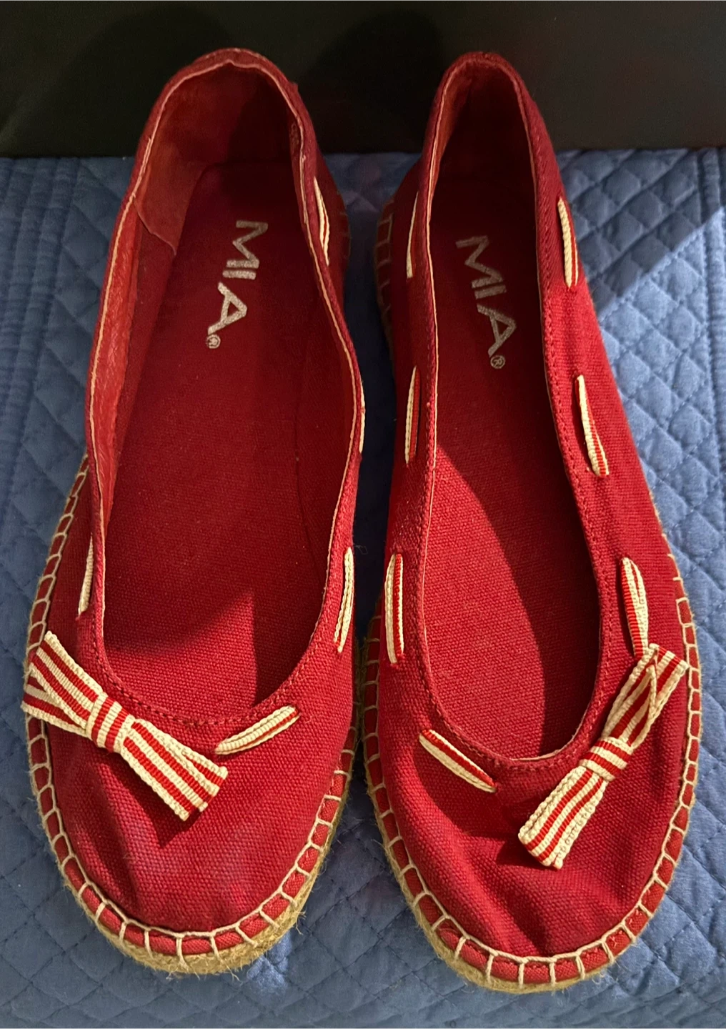 Red MIA espadrille flats with a cute bow detail on the toe. These shoes feature a canvas upper and a jute sole for comfort. Size 7 women's.