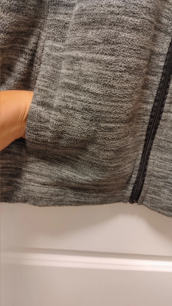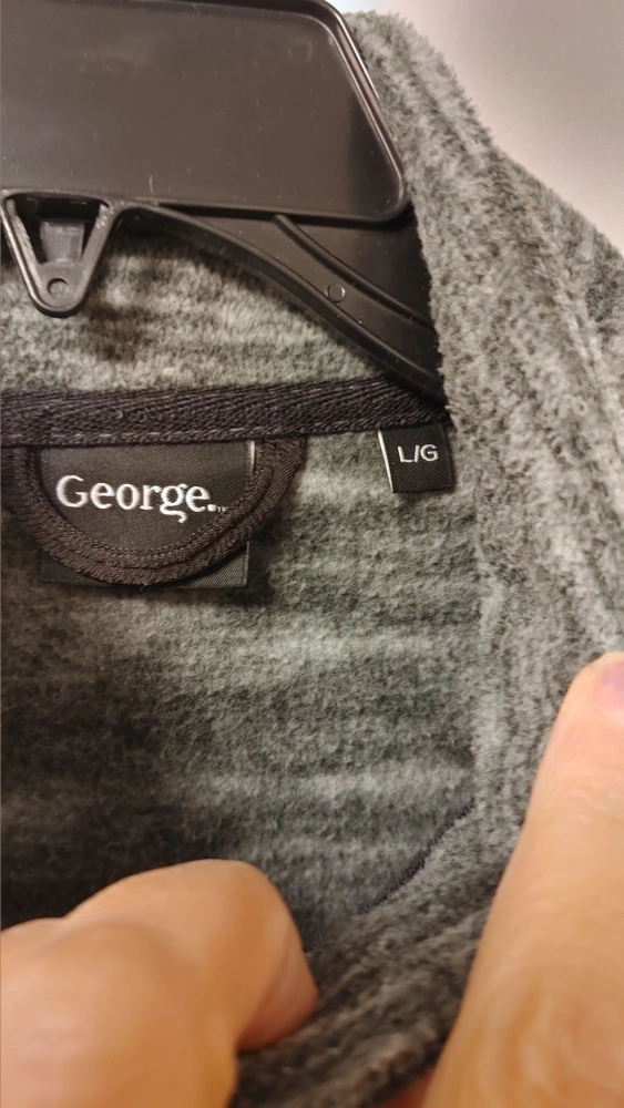 This George brand fleece jacket is grey with a marled texture. It features a full zip closure and two front pockets. It's a size large.