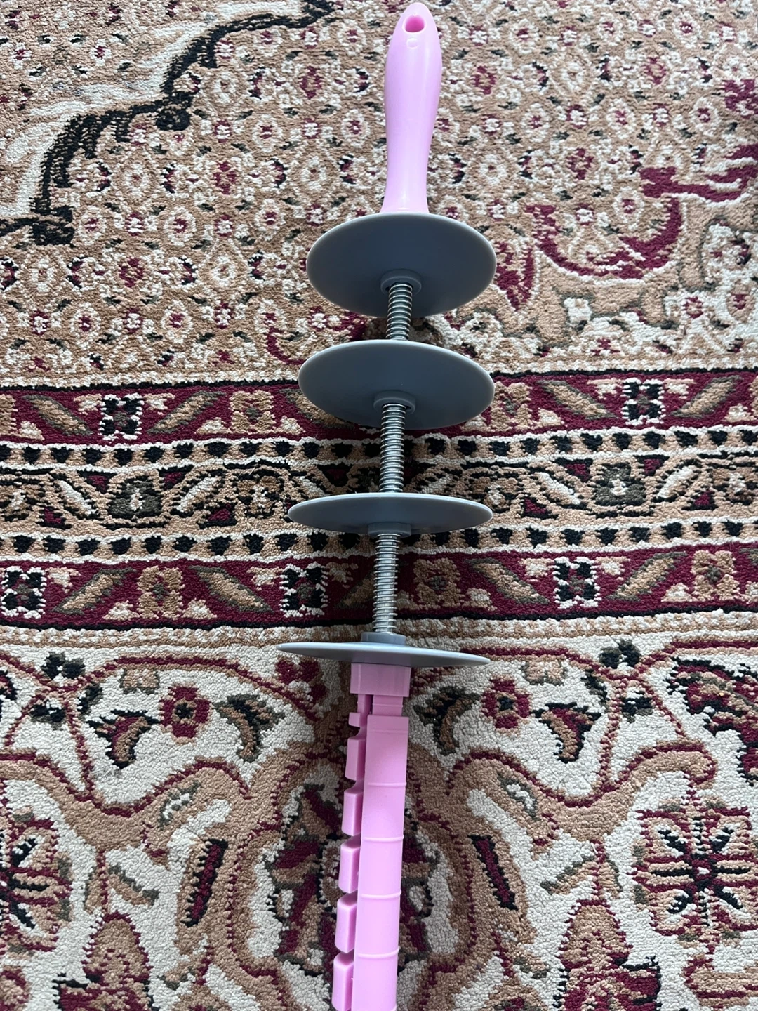 This set includes a cake leveler with adjustable tiers. It's made of durable plastic and metal components. This tool is useful for ensuring even cake layers when baking!