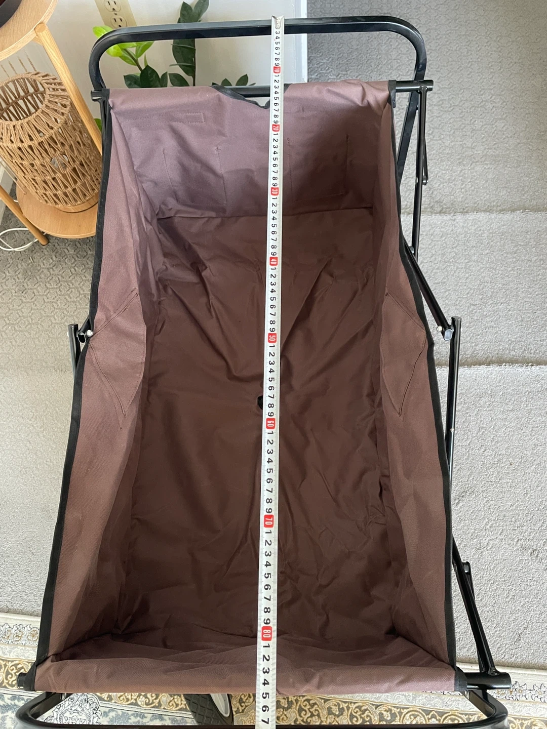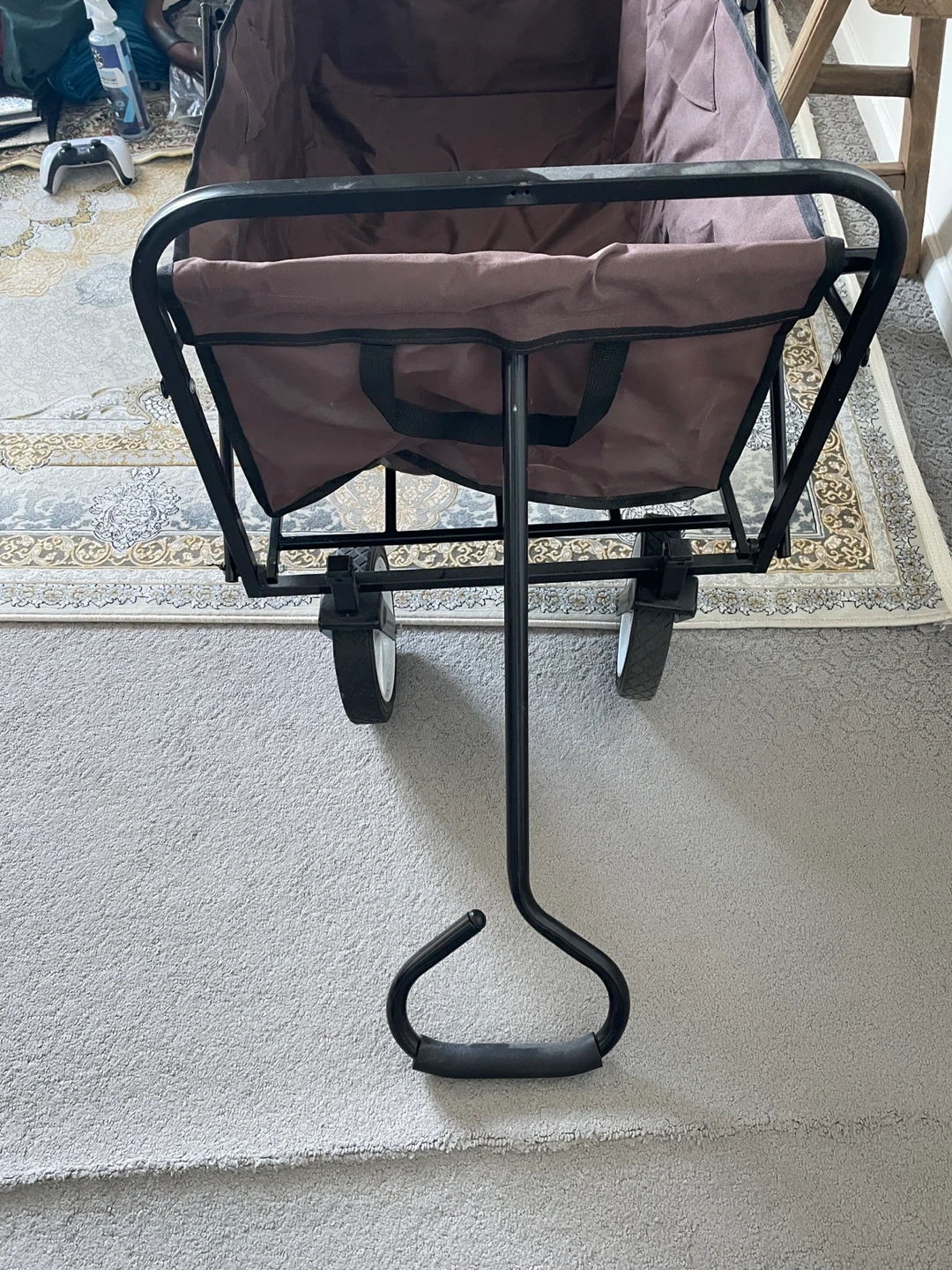 This brown collapsible wagon is great for hauling your gear. It's made with a sturdy metal frame and durable fabric. The wheels make it easy to move around on various surfaces. It folds down for convenient storage!