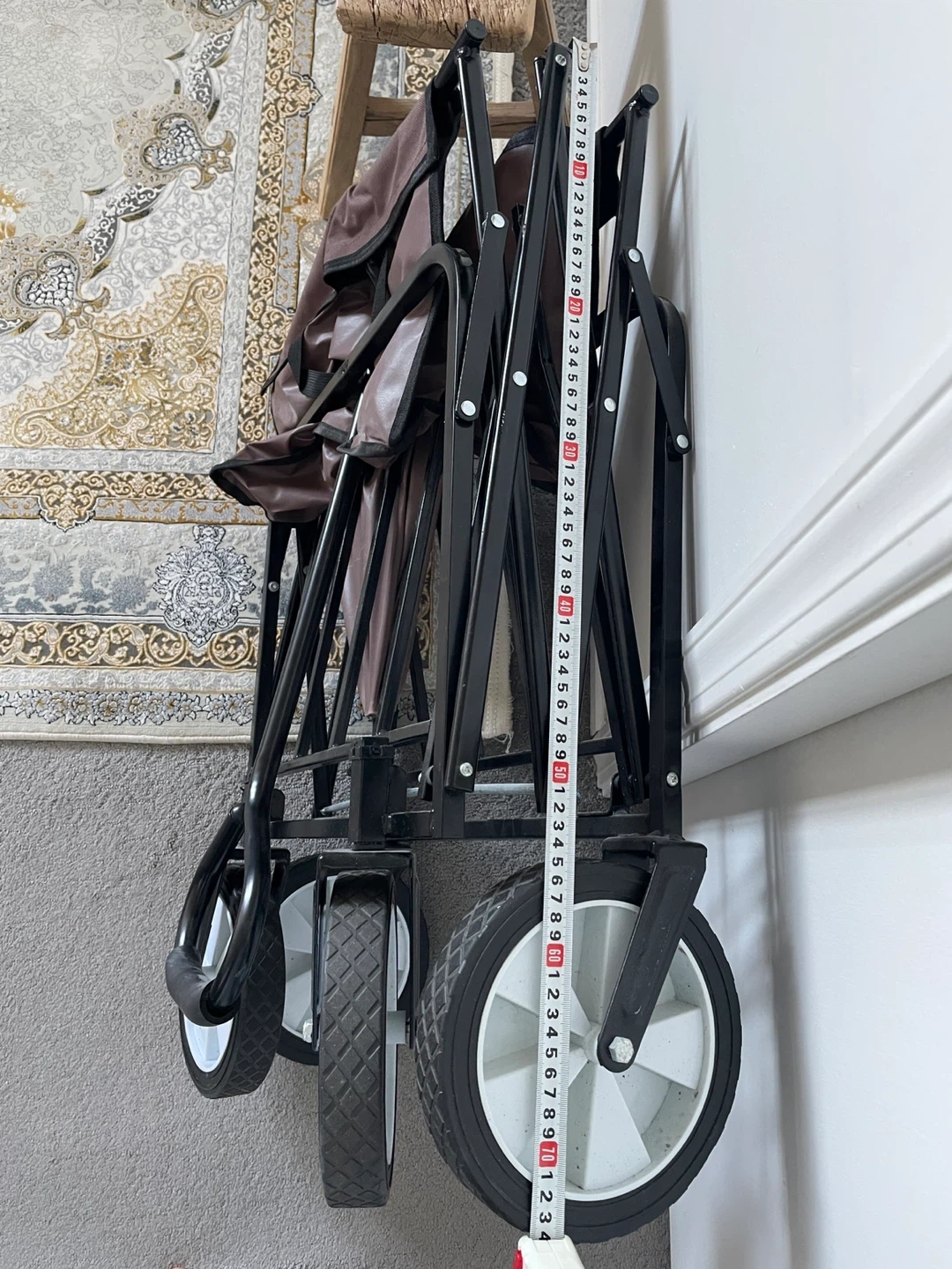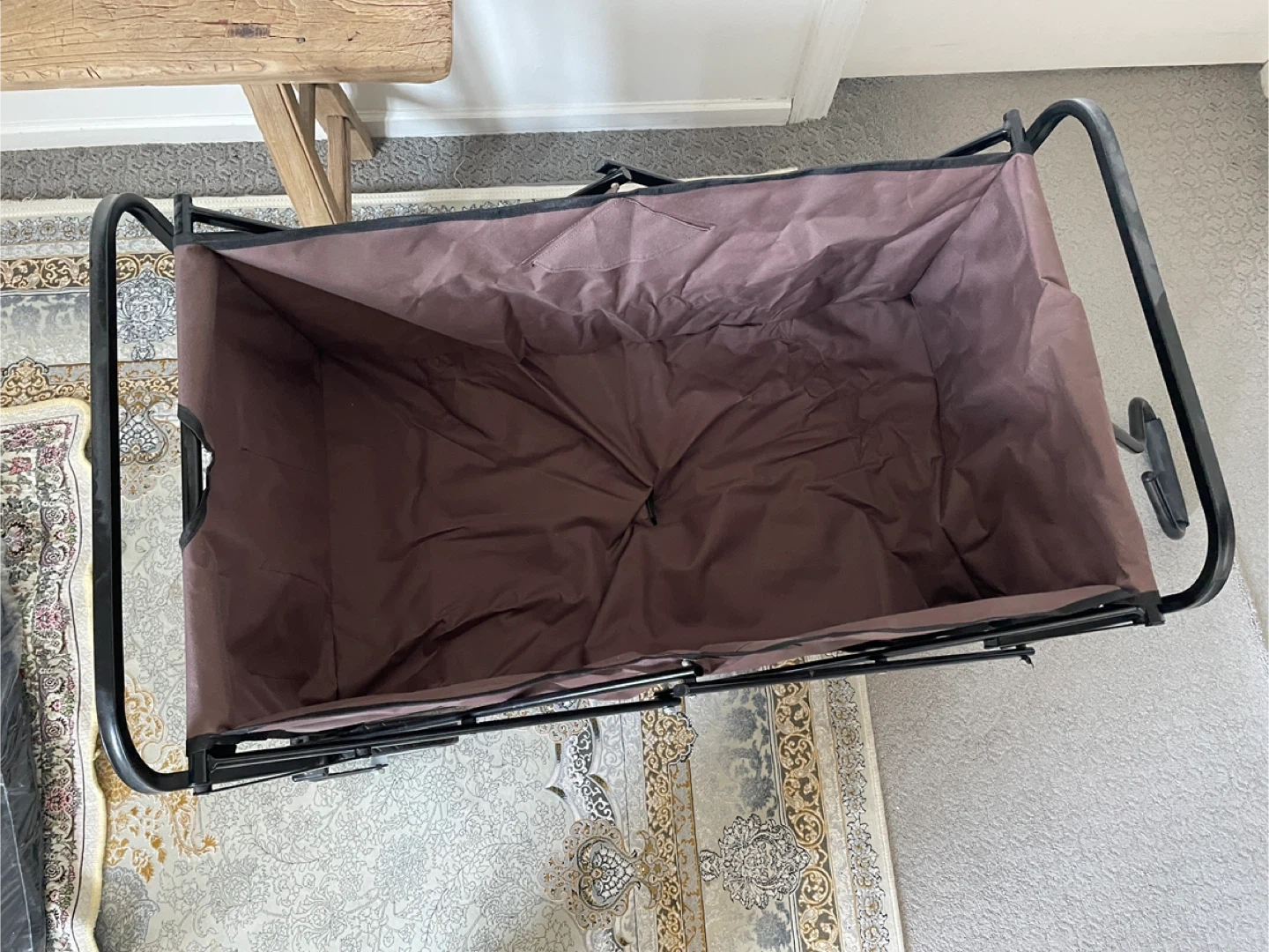 This brown collapsible wagon is great for hauling your gear. It's made with a sturdy metal frame and durable fabric. The wheels make it easy to move around on various surfaces. It folds down for convenient storage!