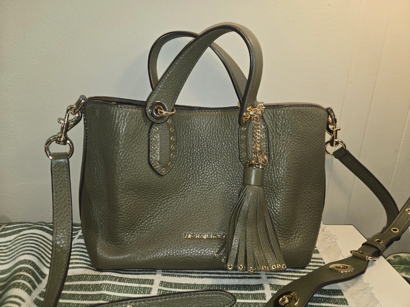 This is a Michael Kors satchel handbag in an olive green pebbled leather. It has a tassel detail and gold-tone hardware. Comes with a detachable shoulder strap. Interior has a zip pocket.