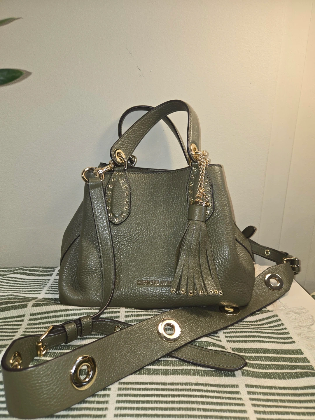 This is a Michael Kors satchel handbag in an olive green pebbled leather. It has a tassel detail and gold-tone hardware. Comes with a detachable shoulder strap. Interior has a zip pocket.