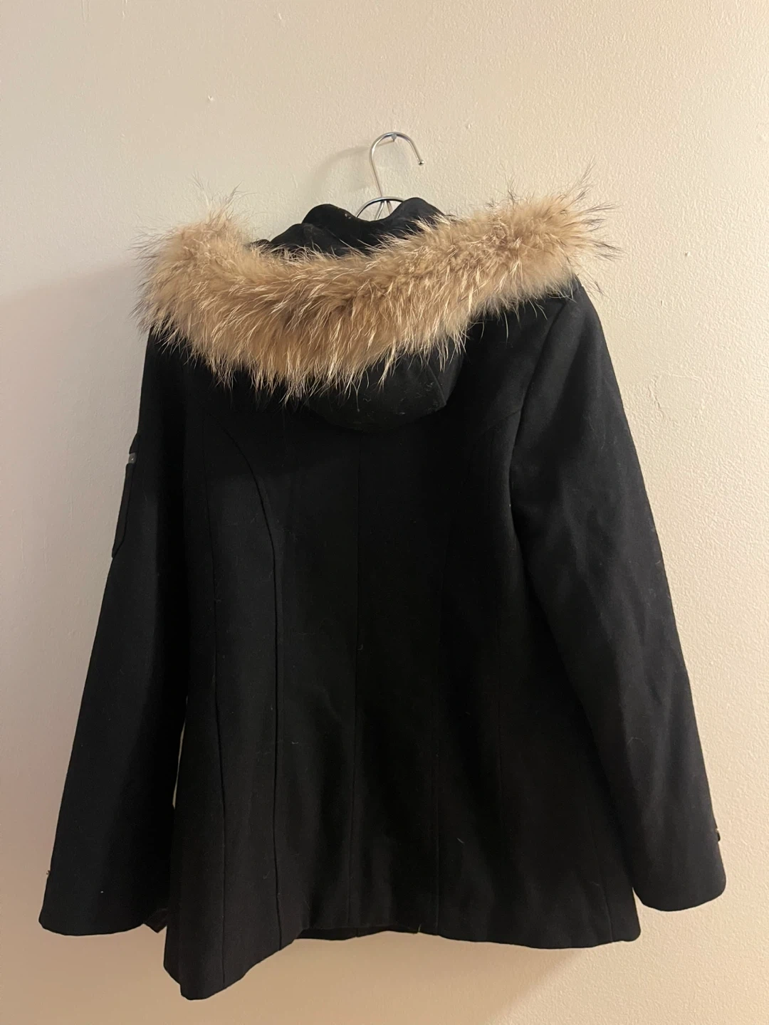 Selling a stylish black “Laura” fall/winter lined peacoat that's perfect for staying warm during the colder months. It features a fur-trimmed hood.