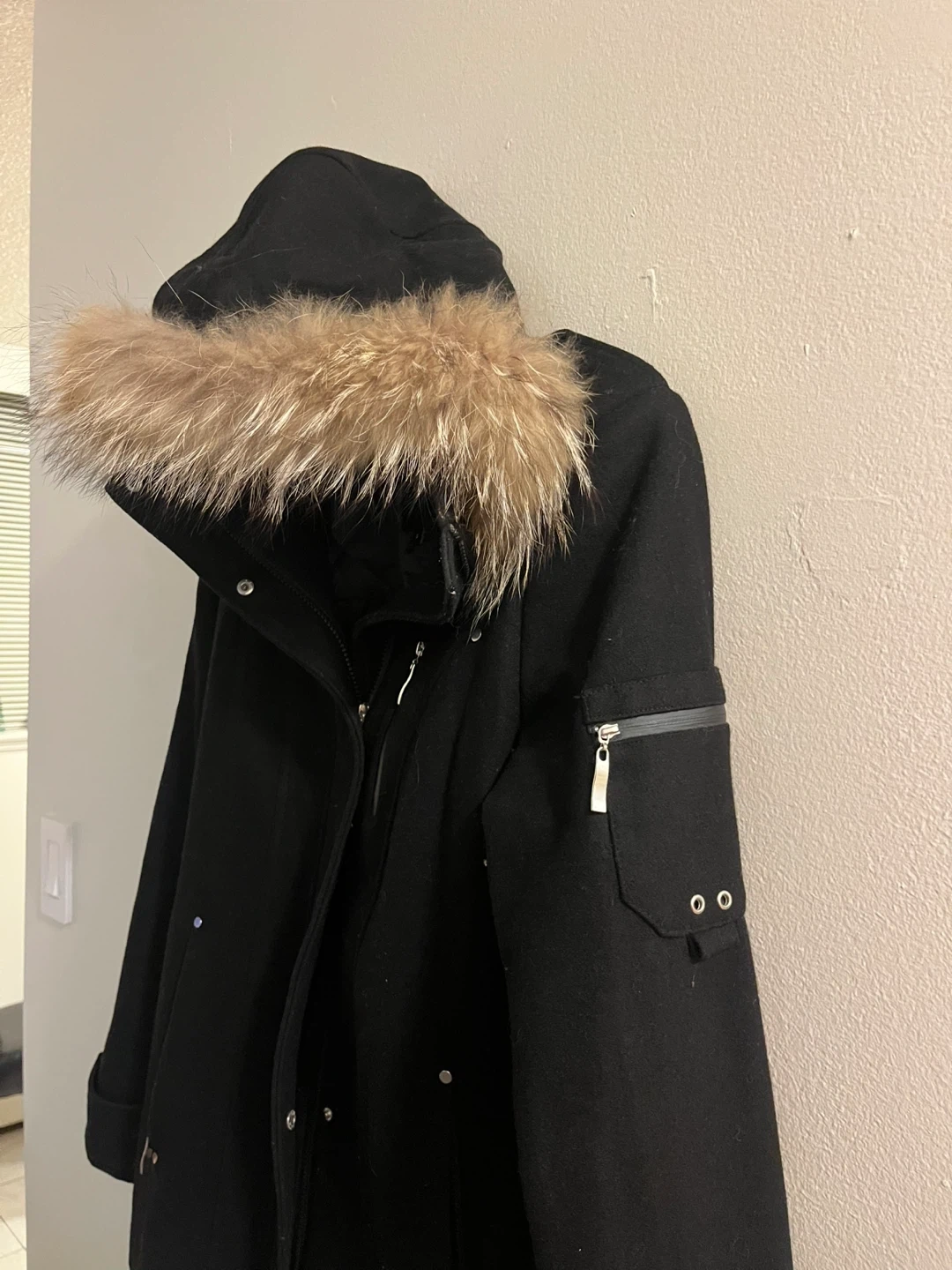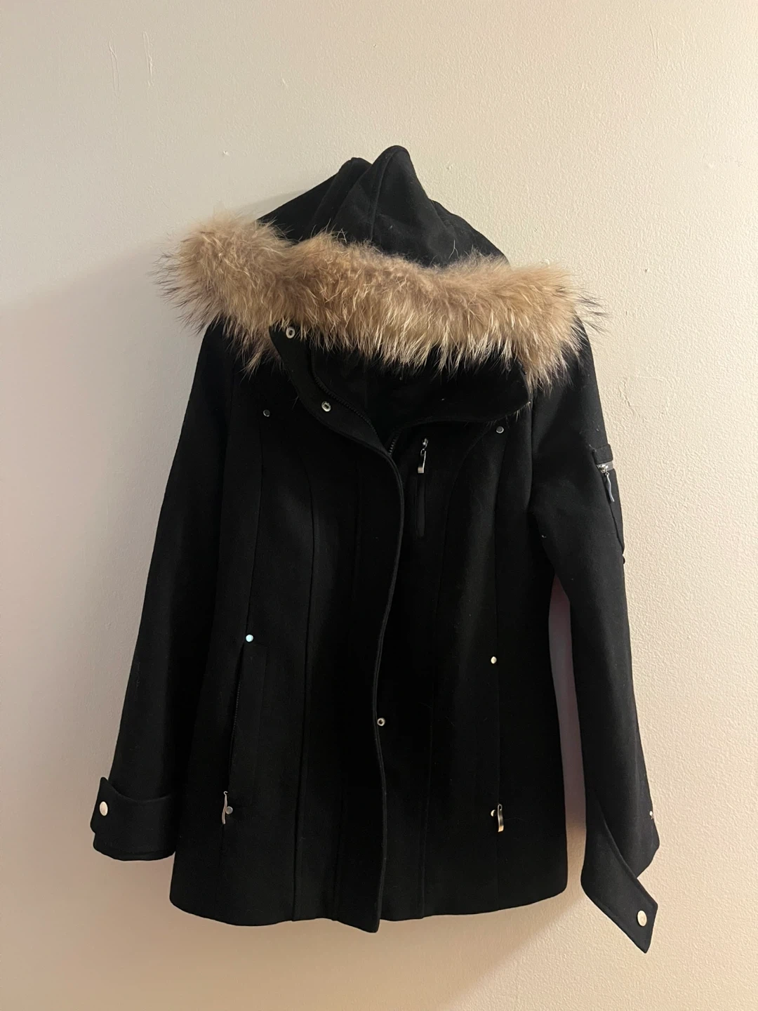 Selling a stylish black “Laura” fall/winter lined peacoat that's perfect for staying warm during the colder months. It features a fur-trimmed hood.